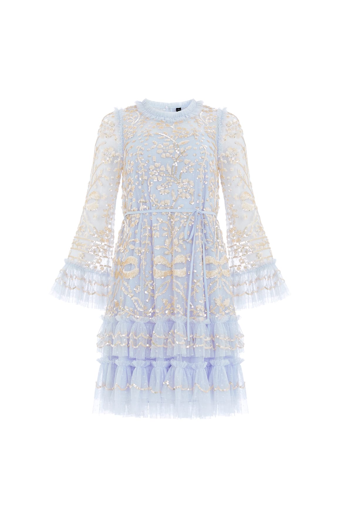 The Celia Long Sleeve Mini Dress in Dusk Blue/Gold. This statement dress is designed with romantic artwork featuring ornate florals and ribbon bows, densely embellished with shimmering sequins for exquisite detailing. Crafted with an effortless loose fit with soft, playful tulle frills on the hem and cuffs. A key piece in our collection.