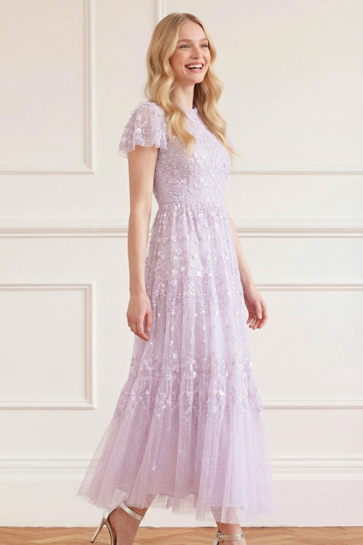 NEW SEASON. The Clover Short Sleeve Ankle Gown in Powder Lilac. This elegant gown features a refined short sleeve silhouette inspired by painted English gardens. Finished with a fluid ankle-length skirt, it creates a timeless and feminine shape for special occasions.