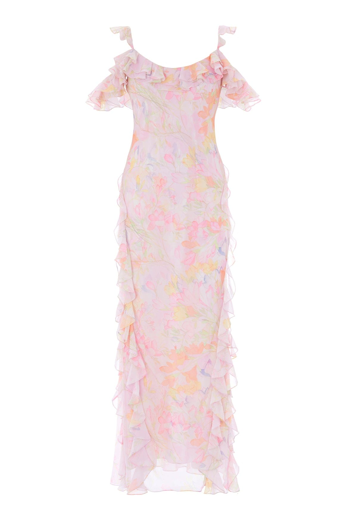 NEW SEASON. The Floating Freesias Georgette Cami Gown in Peony Pink. Inspired by an archive hand-painted wallpaper from the early 1900s, this gown features scattered freesia florals in romantic tones. Cut on the bias for a fluid drape that effortlessly skims the body, with a delicate cami silhouette for light elegance.