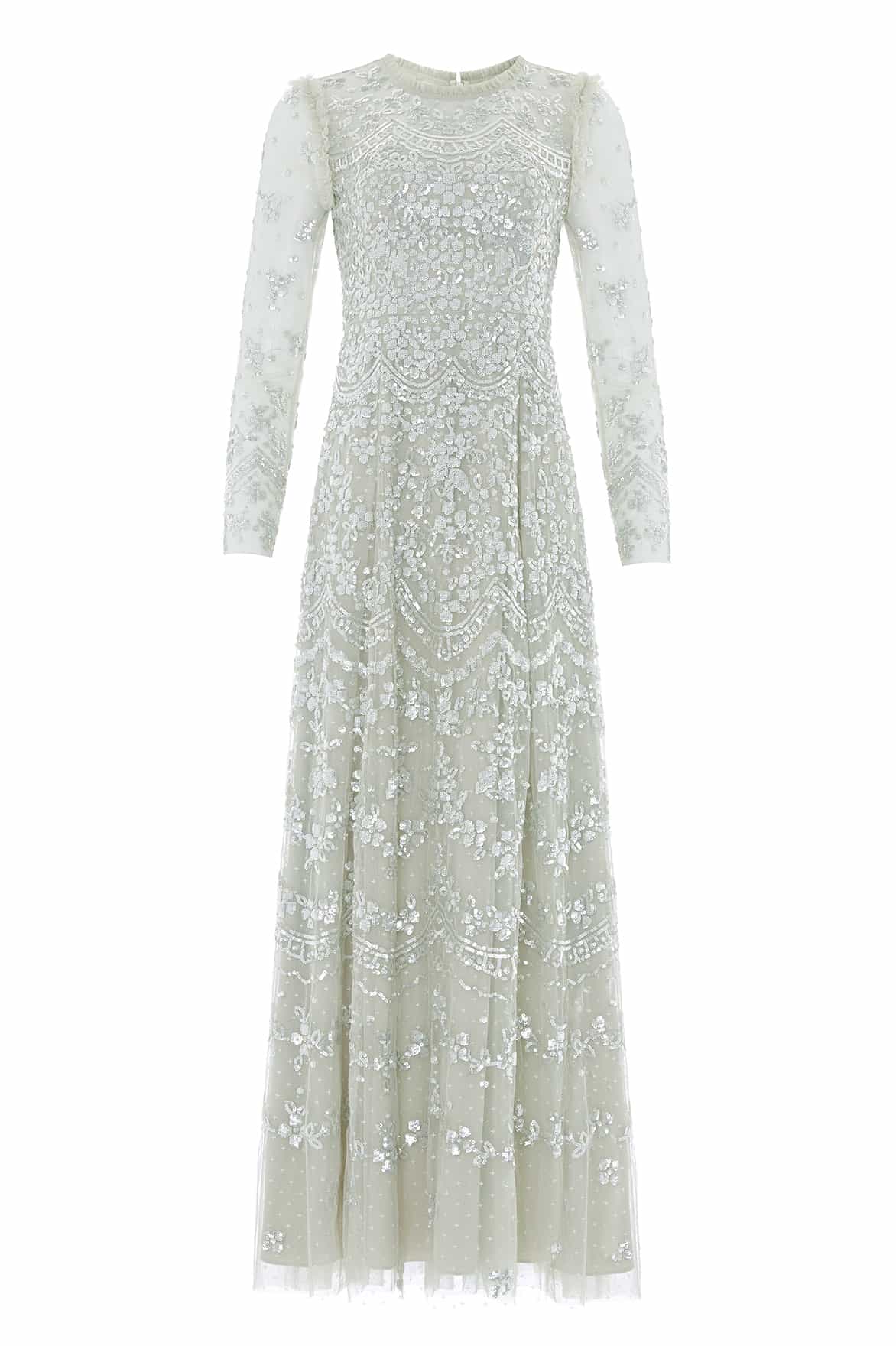 NEW SEASON. The Freya Long Sleeve Gown in Seafoam. Featuring intricate sequin embellishment with graceful scalloped borders, this long sleeve gown captures the glow of late summer evenings. The fitted bodice and flowing full-length skirt create a flattering, feminine shape. A timeless piece for luxury evening wear.