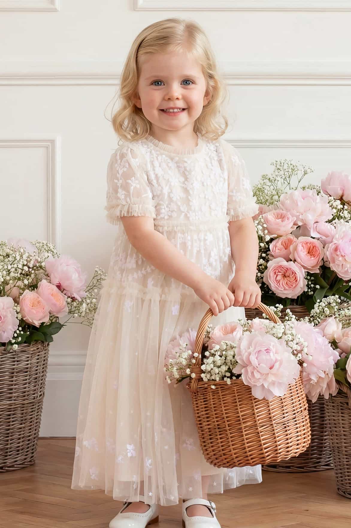 NEW SEASON. The Garland Ribbon Baby Gown in Swan White. Adorned with soft ribbon-inspired embroidery across layers of airy tulle. Designed with a full skirt and gentle gathers, this style brings timeless elegance to baby’s first special occasions.