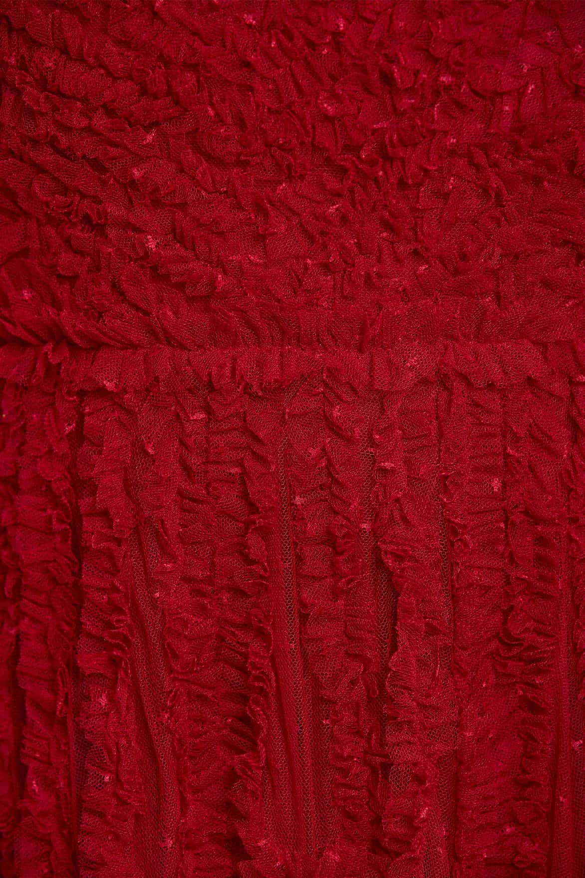 The La Vie En Rose Round Neck Gown in Deep Red. This gown is adorned with delicate tulle ruffles, engineered throughout the panels to enhance the silhouette. Developed with gathered ruffles throughout for a romantic texture. Make a statement in the La Vie En Rose.