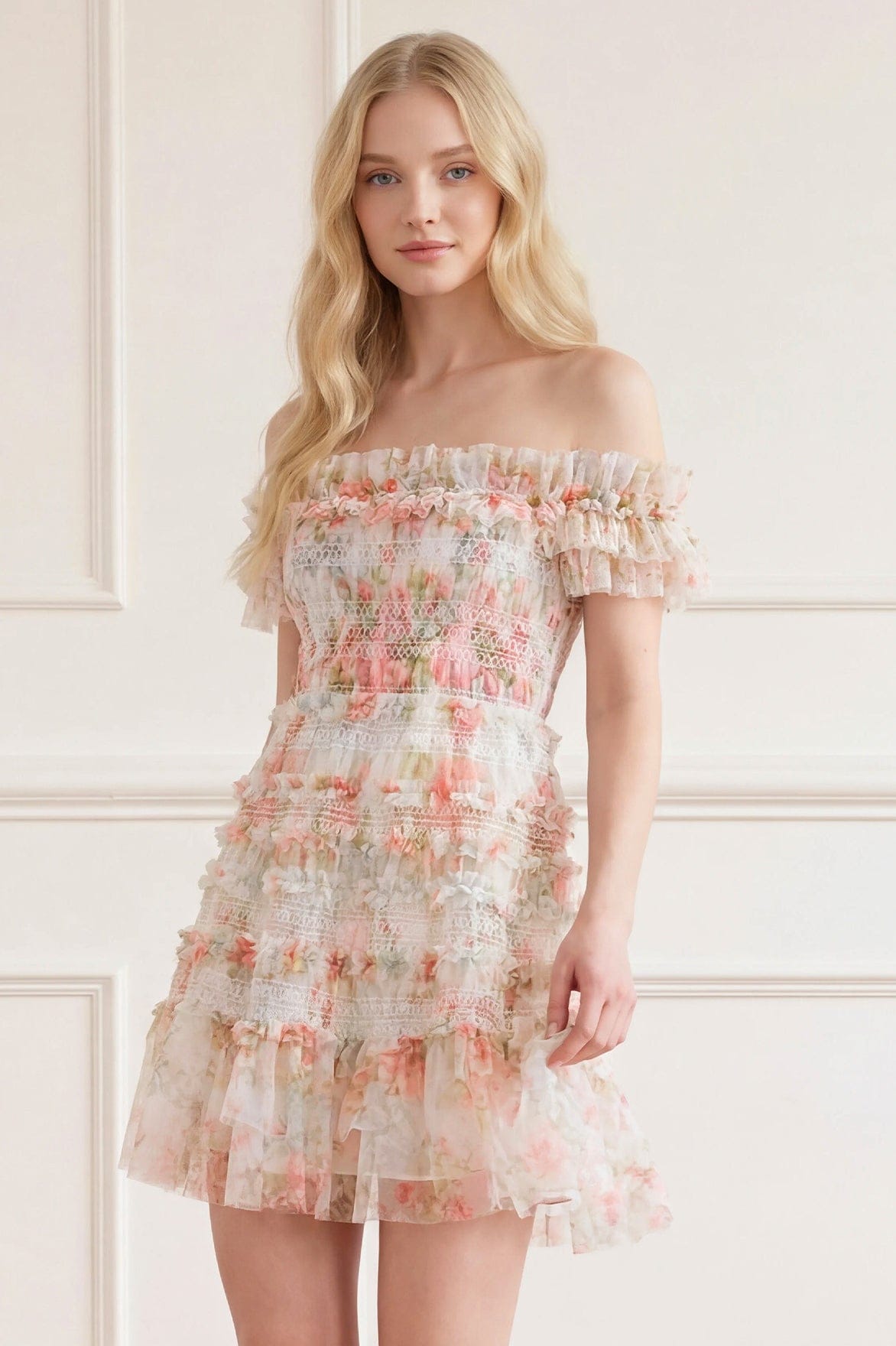 NEW SEASON: The Madame Rose Elodie Off-Shoulder Micro Mini Dress in Moonshine. This opulent dress features an archive-inspired rose print, with an off-shoulder neckline framed by layers of gathered ruffles, creating a soft, romantic effect. The intricate linear smocking design, complemented by signature Needle & Thread tulle frills, gracefully graduates towards the sweeping hem, sculpting a flattering silhouette. Crafted from delicate layers of net and tulle, the skirt flows effortlessly with every movement. An internal stretch power-mesh corset ensures exceptional comfort and shape, while soft boning, encased in grosgrain ribbon, offers refined couture detailing. Elastic trim and adjustable hook-and-eye fastenings provide a customizable, perfect fit.