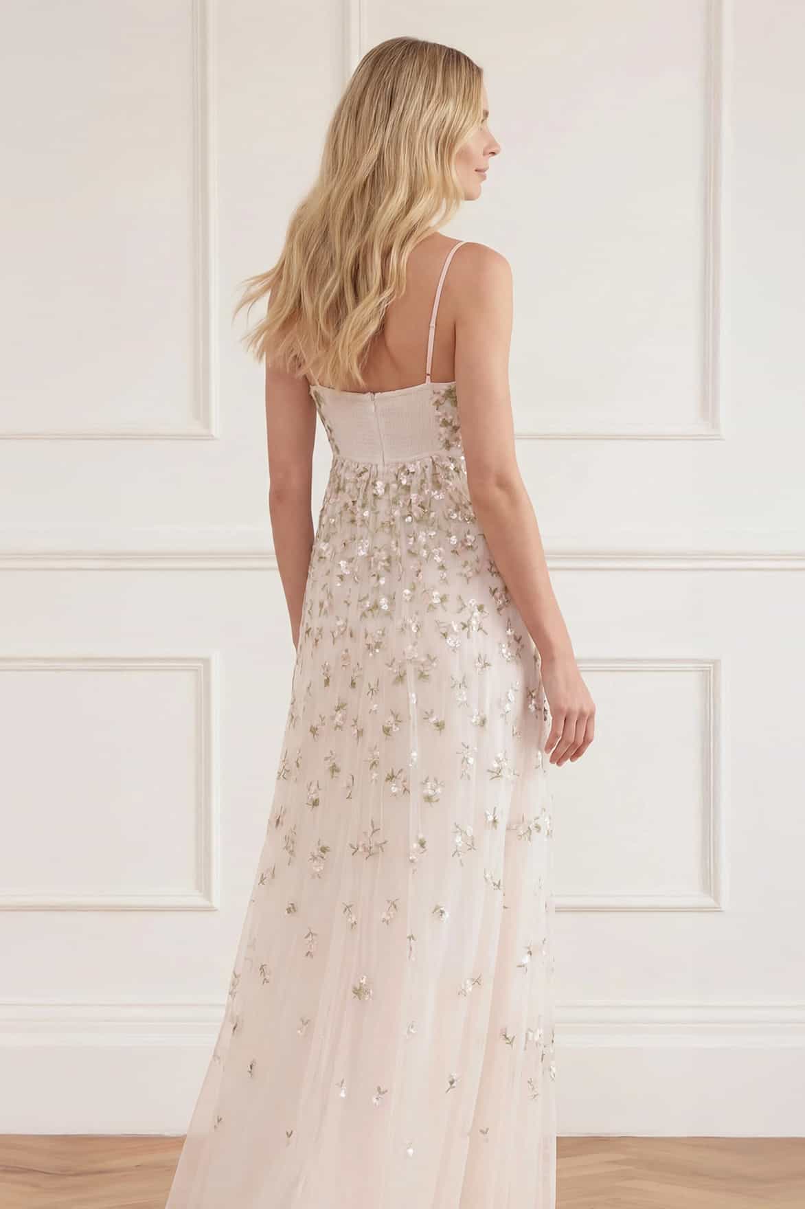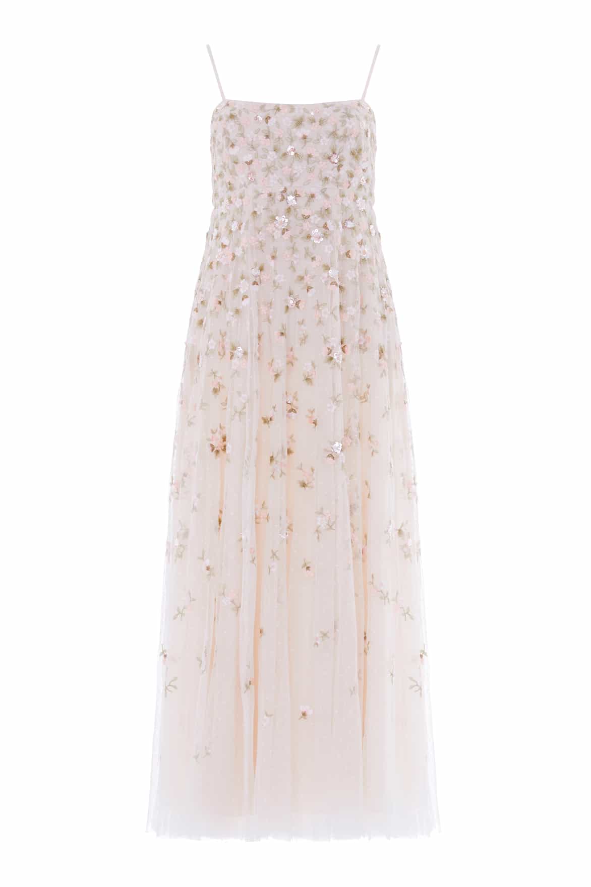NEW SEASON | NEEDLE & THREAD EXCLUSIVE. The Meadow Ditsy Cami Gown in Swan White/Peach. Adorned with delicate floral ditsy embroidery accented with shimmering sequins, this full-length cami gown exudes effortless femininity. Designed with slim straps, a circle-cut skirt and a shirring panel at the back bodice for ease of wear.