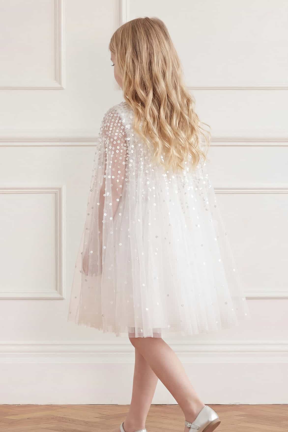 NEW SEASON. The Moonlight Sequin Cape Kids Dress in Swan White. Inspired by the shimmer of moonlit skies, this kids dress features delicate sequin detailing across a relaxed silhouette. Finished with a flowing cape detail and a softly layered skirt, it creates magical movement. A beautiful choice for a special occasion.