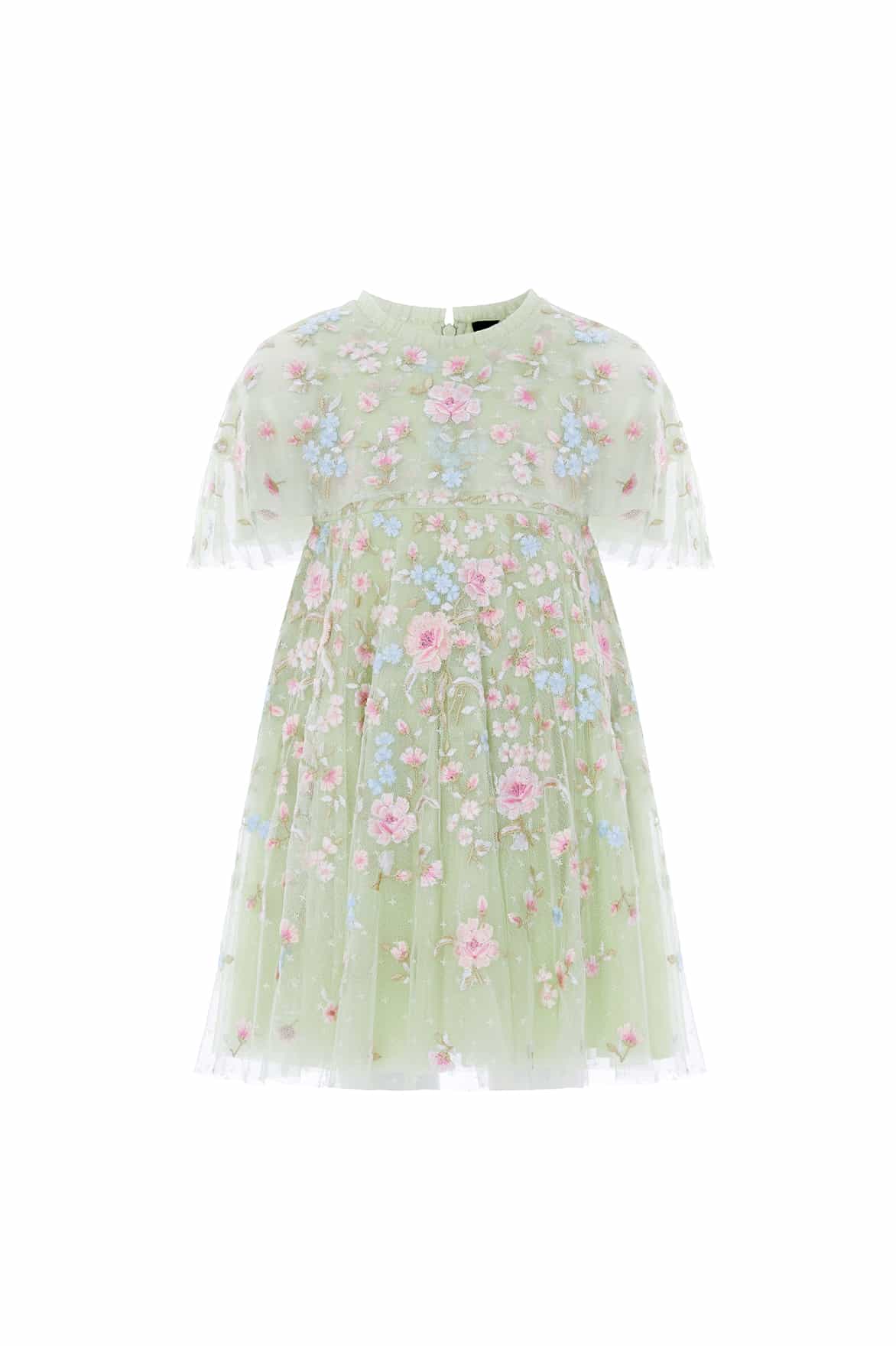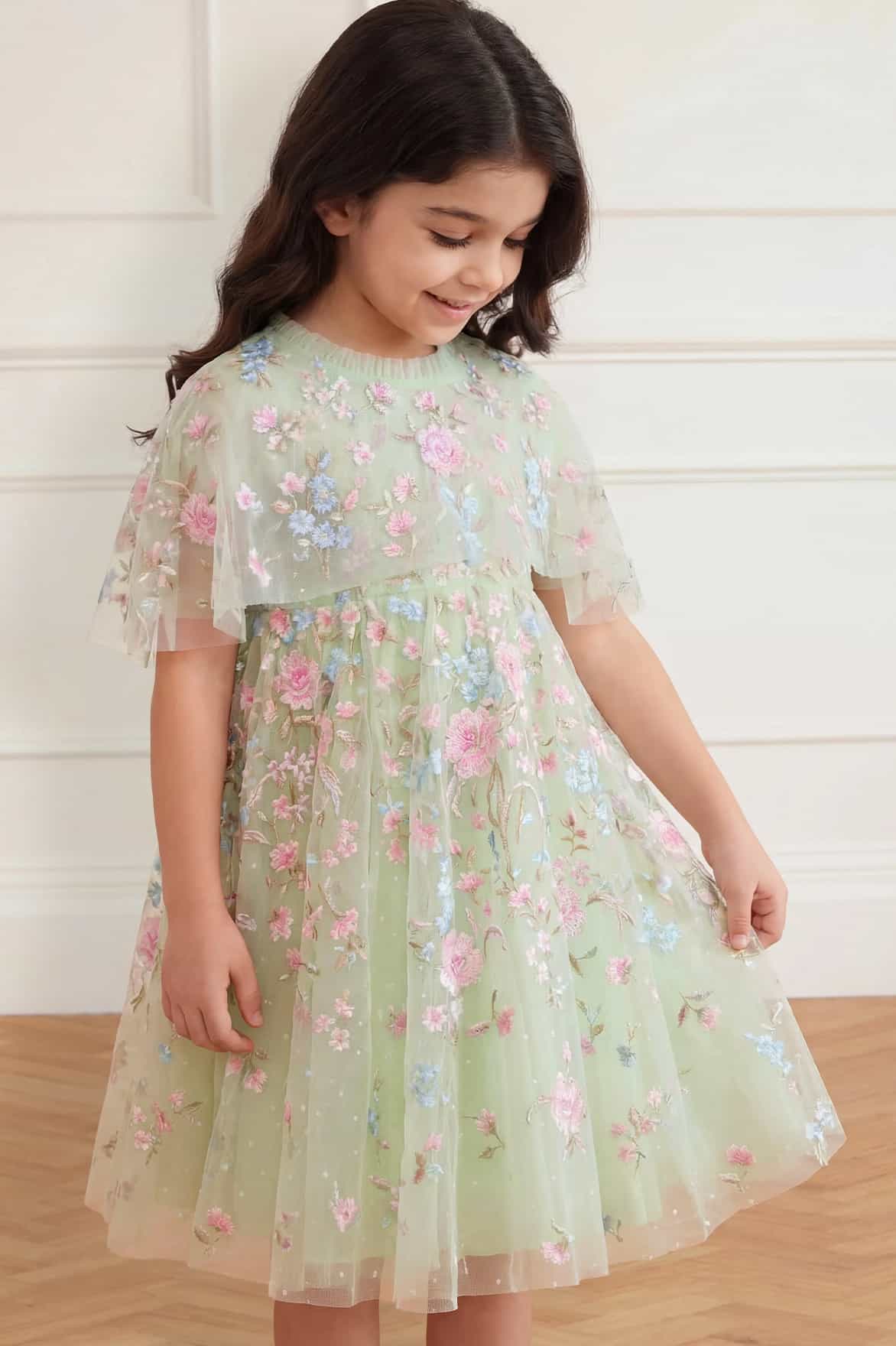 NEW SEASON. The Peony Bouquet Cape Kids Dress in Peppermint/Multi. Adorned with romantic floral embroidery inspired by early 1900s garden artwork, this kids dress features a flowing cape detail. The relaxed shape and softly layered skirt create graceful movement. A luxurious flower girl style.