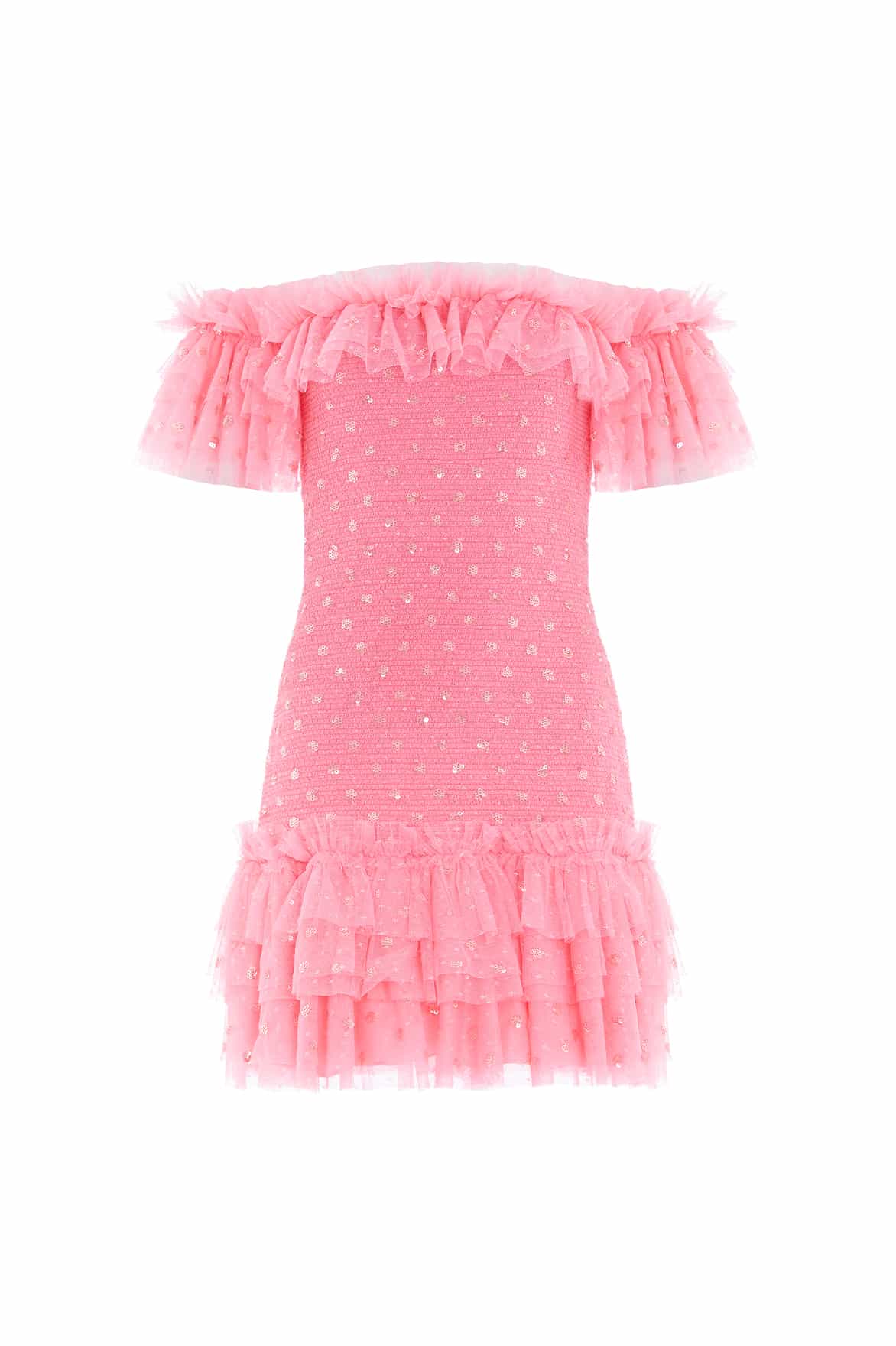 The Polka Dot Smocked Micro Mini Dress in Coral. A brand new statement style for the season ahead. Developed beautifully with signature, frothy tulle in fully stretch fabric for a fitted design. This dress is scattered with polka dot motifs in shimmer sequins to create a glistening effect. Adorned with an elasticated smocking body falling into a layered frothy tulle skirt for a playful, contemporary look. This dress features an off-shoulder design using elasticated layers of tulle to create comfort and signature Needle & Thread styling. We hope you adore this dress as much as we do.