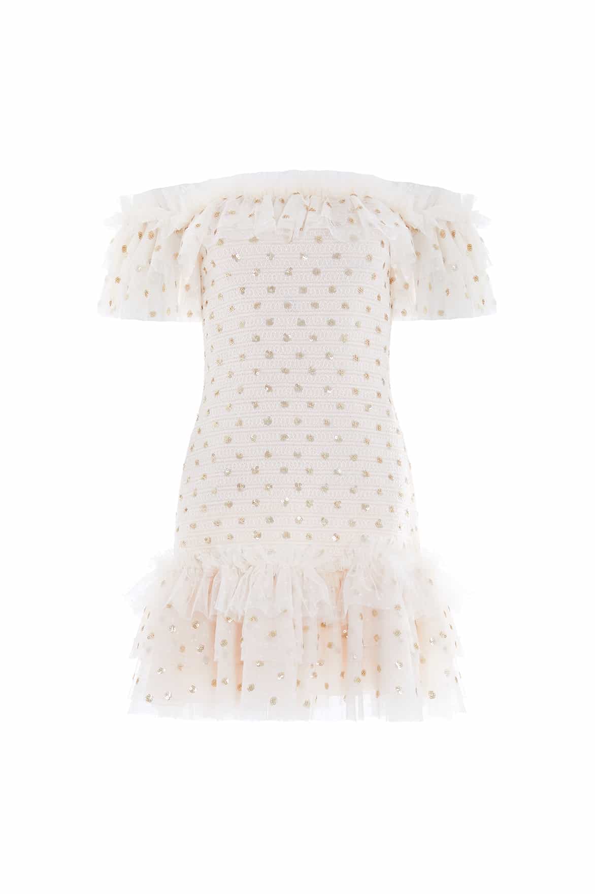 The Polka Dot Smocked Micro Mini Dress in Cream / Gold. A brand new statement style for the season ahead. Developed beautifully with signature, frothy tulle in fully stretch fabric for a fitted design. This dress is scattered with polka dot motifs in shimmer sequins to create a glistening effect. Adorned with a elasticated smocking body falling into a layered frothy tulle skirt for a playful, contemporary look. This dress features an off-shoulder design using elasticated layers of tulle to create comfort and signature Needle & Thread styling. We hope you adore this dress as much as we do.