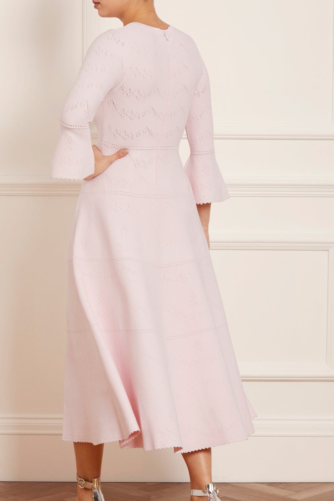 The Pretty Pointelle Knit Ankle Gown in Pink. A brand new style for Needle & Thread. This knitted gown is inspired by vintage ditsy florals and lace. Beautifully designed with all-over pretty pointelle stitch, delicate florals and scallop details. This gown has a fitted stretch bodice with a soft, round neckline, fluted cuffs and signature Needle & Thread detailing. A truly flattering piece.