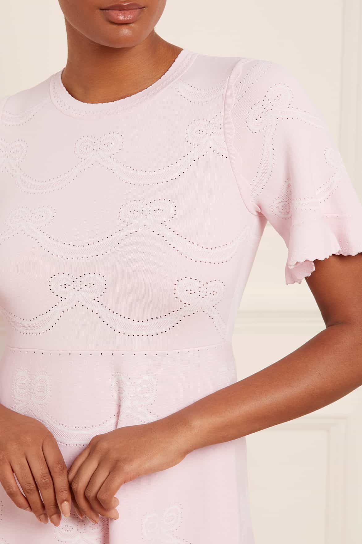 The Ribbon Bow Knit Ankle Gown in Pink / White. This gown is beautifully engineered with ribbon bow motifs creating a pretty and feminine design. Developed from a recycled viscose fabric for a flattering and comfortable fit. Designed with a delicate jacquard pattern framed with pointelle and scallop details. Crafted with a stretch bodice, round neckline and fluted cuffs for signature Needle & Thread elements. Make this gown your new favourite wardrobe staple.