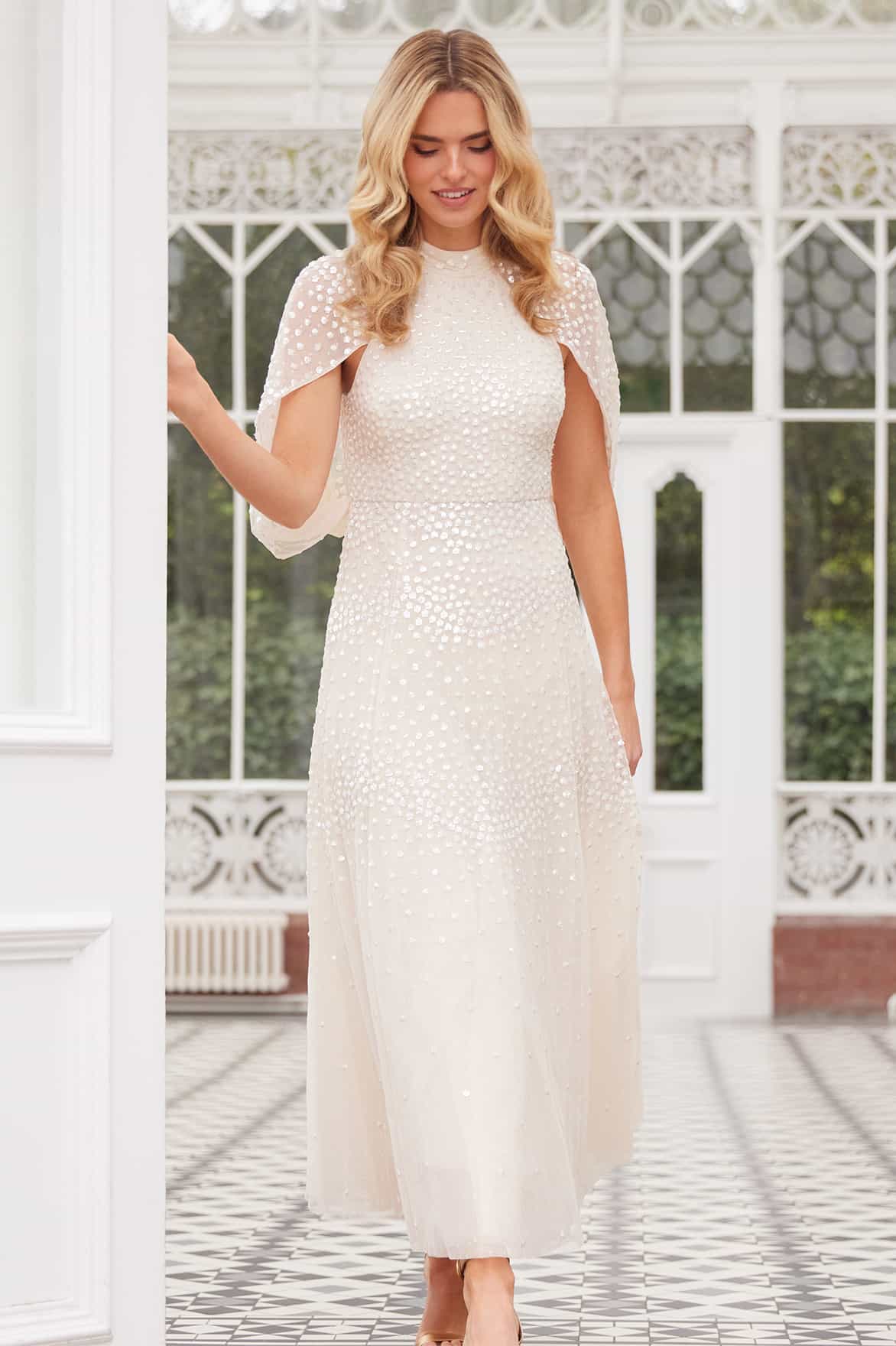 NEW SEASON. The Scallop Sequin Cape Ankle Gown in Cream. An elegant high-neck style with a blouson chiffon cape that gathers at the waist. Embellished with glittering sequins, it creates a dramatic yet graceful statement for evening occasions.