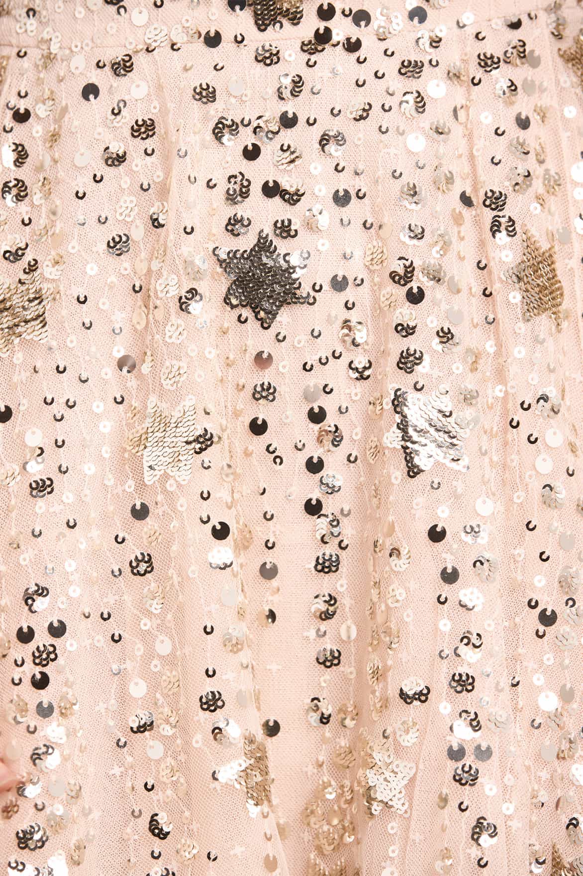 The Shooting Stars Cape Ankle Gown in Dust Beige/Silver. This gown is adorned with shimmering embellishments of intricate star motifs, with clusters of tiny sparkling sequins that scatter towards the hem, creating a breathtaking effect. Inspired by the extravagant costumes worn by the Follie’s dancers of the early 1900s, this statement gown features an exquisite, embellished cape integrated into the gown. The elegant, flattering neckline is adorned with signature Needle & Thread frills, while the skirt is developed of layers of signature Needle & Thread soft tulle for romantic styling.