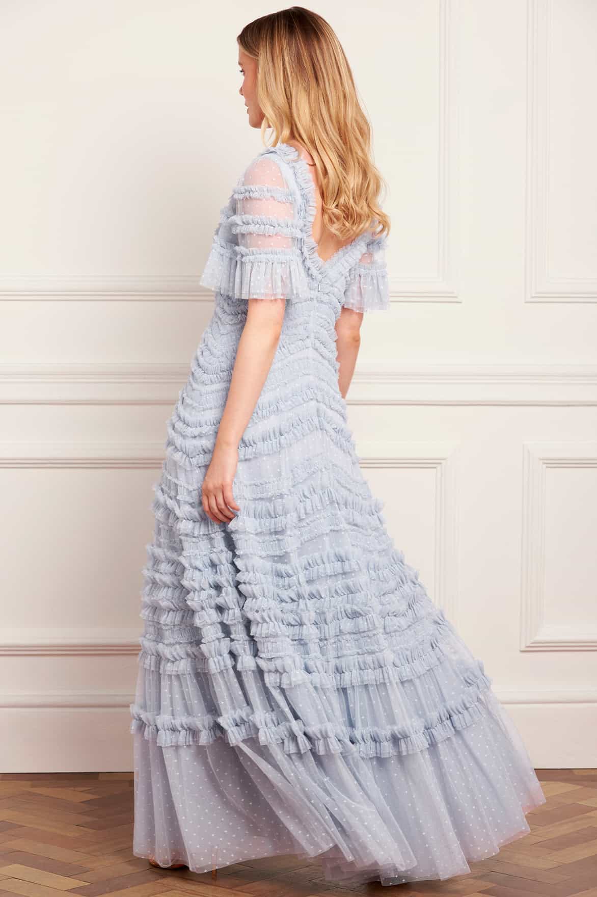 NEW SEASON. The Amara Ruffle Gown in Skylight. A true statement of romantic artistry. Crafted from layers of frothy tulle, the gown features curved bands of ruffles that flow gracefully across the body and cascade into a voluminous skirt, creating dramatic movement and charm.