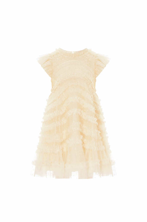 NEW SEASON | NEEDLE & THREAD EXCLUSIVE. The Amara Ruffle Sleeve Kids Dress in Lemon Sorbet. Designed with a relaxed shape, this dress features delicate ruffle sleeves and a full, twirl-worthy skirt with soft layered volume. Inspired by dreamy garden blooms, it feels light, special and comfortable. Beautifully complemented by coordinating the Amara Backless Ballerina Dress.