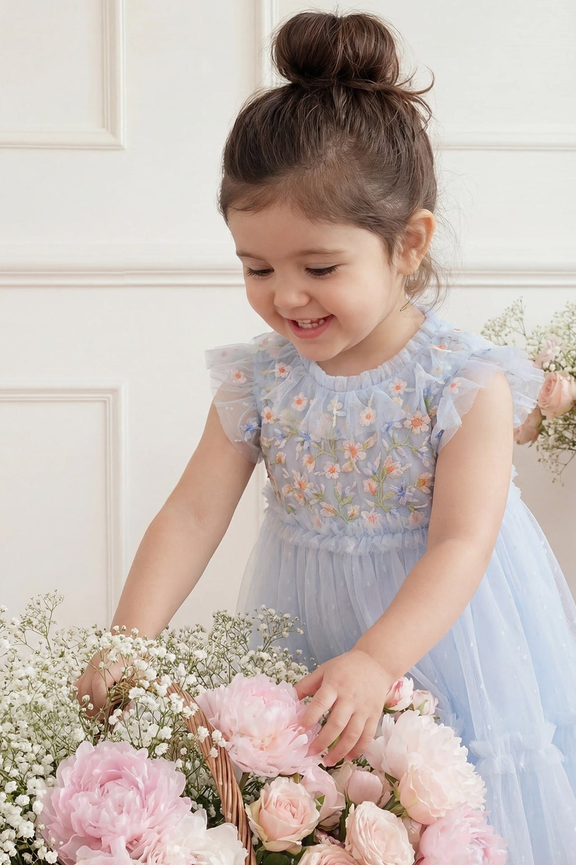 The Antoinettes Floral Bodice Baby Dress in Dusk Blue. A dreamy piece inspired by the romance of Versailles. Crafted with delicate multicoloured floral embroidery scattered across a cloud of tulle, signature frills at the neckline and waist add a touch of enchantment. Designed with layered tulle sleeves and a gently ruffled skirt, it creates a floaty, ethereal silhouette. Finished with a breathable cotton voile lining and frilled bloomers for comfort. This dress is perfect for every magical moment.
