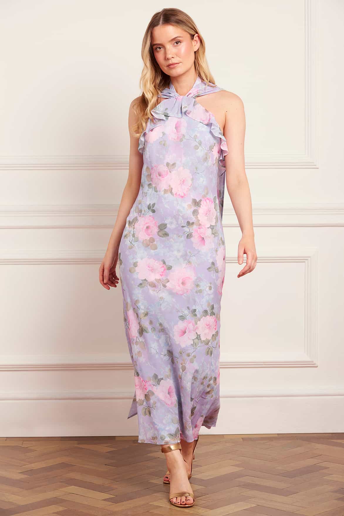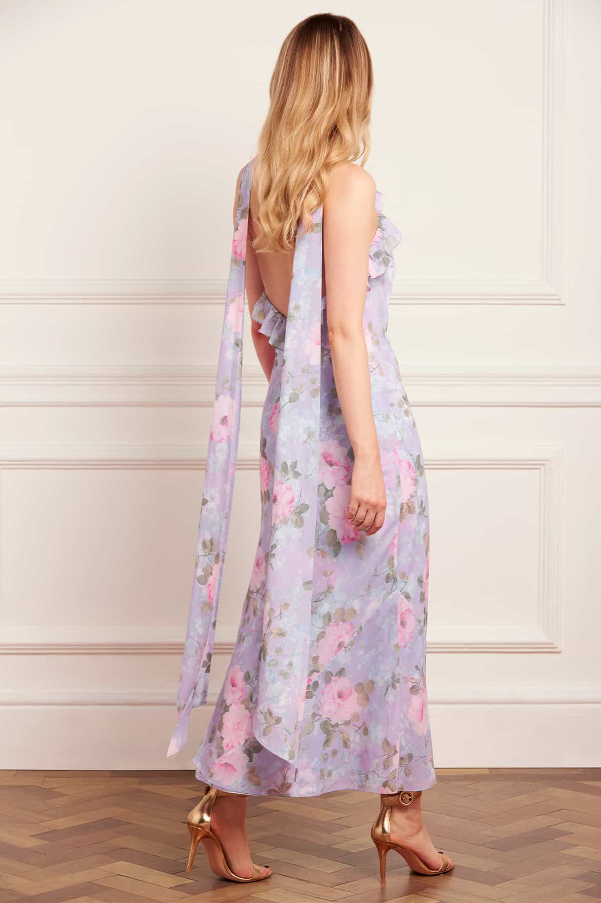 NEW SEASON. The Camille’s Garden Chiffon Halter-Neck Ankle Gown in Lavender. Showcases an archive-inspired floral print in soft pastel hues. Designed with a flattering halter neckline and a flowing chiffon skirt, this gown offers an effortlessly graceful silhouette, perfect for light spring and summer occasions.