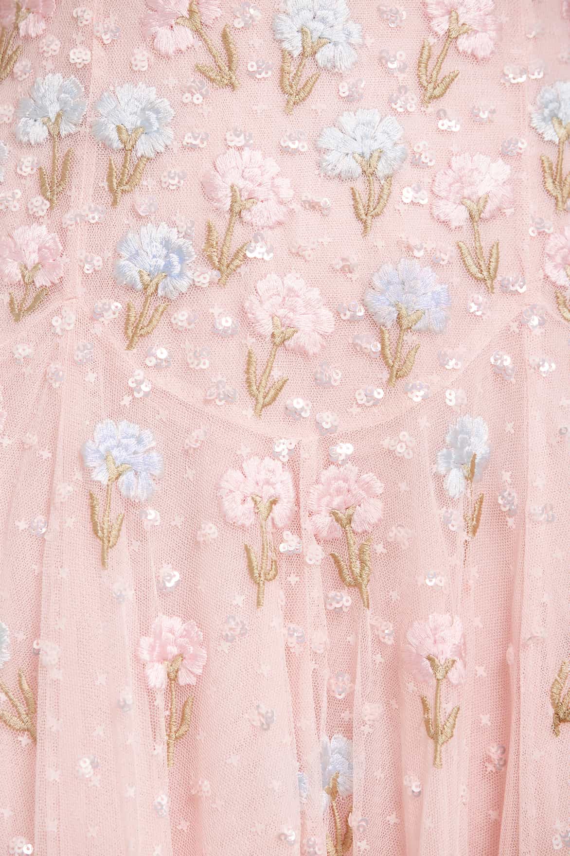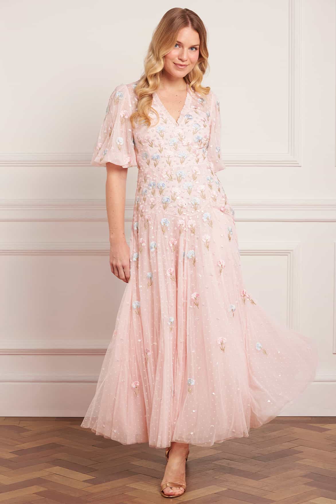 NEW SEASON. The Dandelion Ditsy Ankle Gown in Seashell. Decorated with delicately stitched dandelion motifs in soft pastel tones. Crafted from airy tulle that fades gently towards the hem, this gown captures a dreamy, ethereal feel perfect for special occasions.