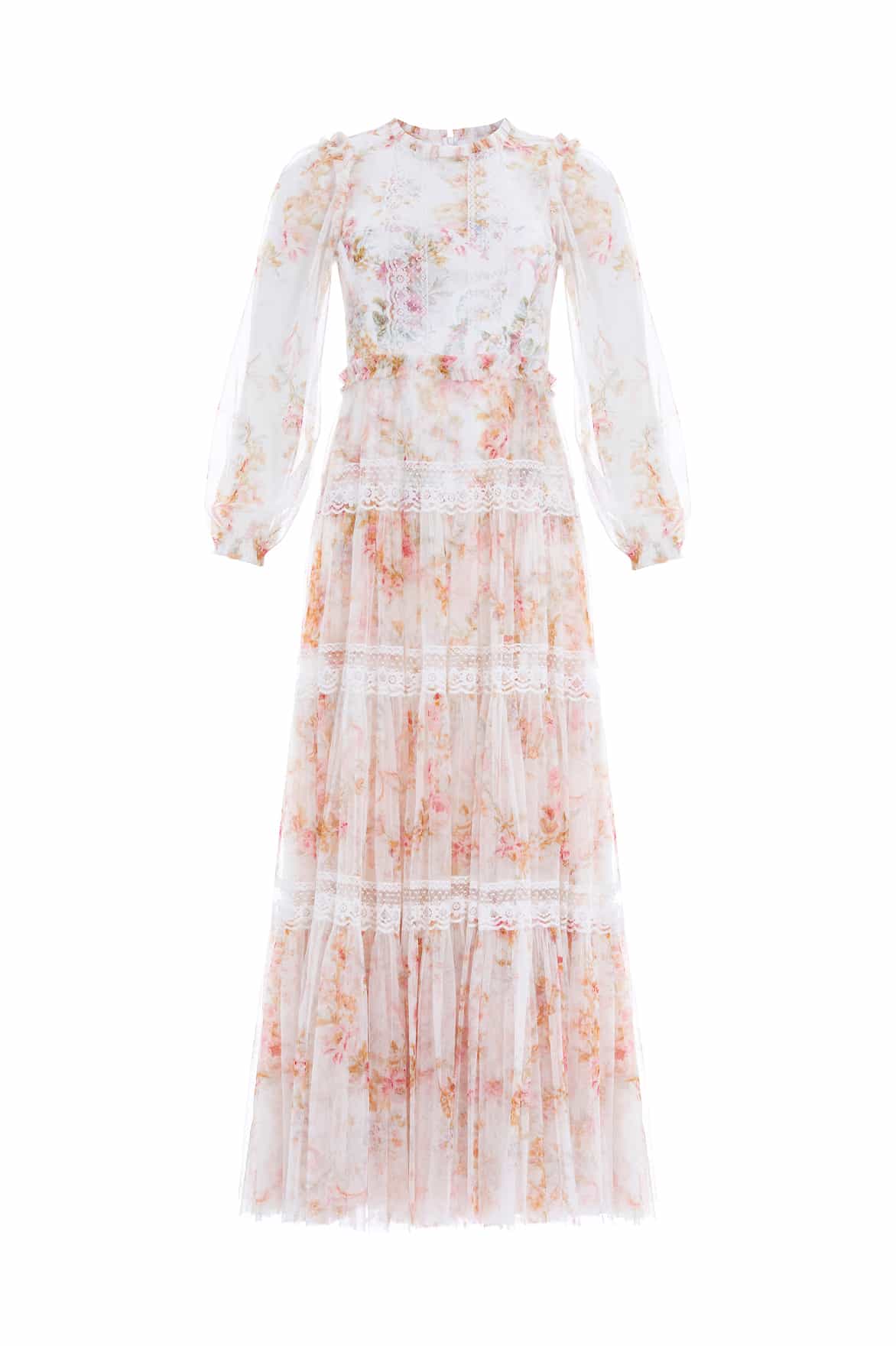 The Enchanted Garden Lace Ankle Gown in Moonshine. Beautifully designed with a signature Needle & Thread style print taken from archive hand-painted wallpaper depicting romantic garden florals and historical motifs. Inspired by Victorian styling, featuring lace trims that are perfectly positioned along gently gathered skirt tiers, adorning this printed tulle gown. Crafted with sheer printed blouson sleeves with ruffle cuffs and softly gathered tulle frills decorate the neckline, armhole, and waistband. The skirt is made up of layers of signature Needle & Thread soft tulle for romantic styling. A contemporary style you'll forever treasure.