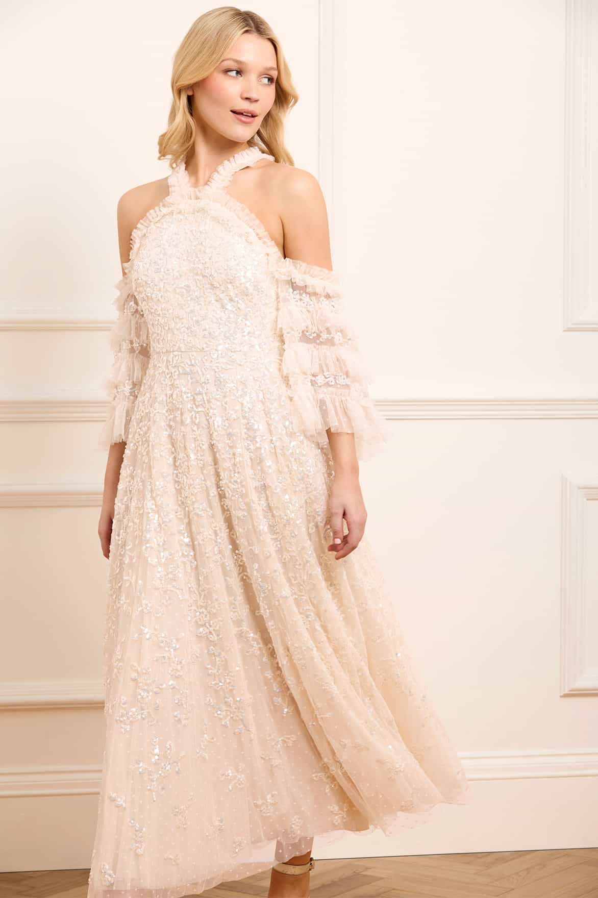 The Floral Lace Off-Shoulder Ankle Gown in Cream. This beautiful dress is embellished with tiny sequins in an overlapping linear formation depicting an exquisite floral design inspired by vintage lace from the early 1900s. The statement off-the-shoulder design has a flattering curved neckline and straps, adorned with signature Needle & Thread soft tulle ruffles. The fluted sleeves are decorated in frothy tulle ruffles and adorned with glittering sequins in floral motifs. The skirt is made up of generous layers of net and tulle with sweeping hemline. The perfect statement style for a special occasion.