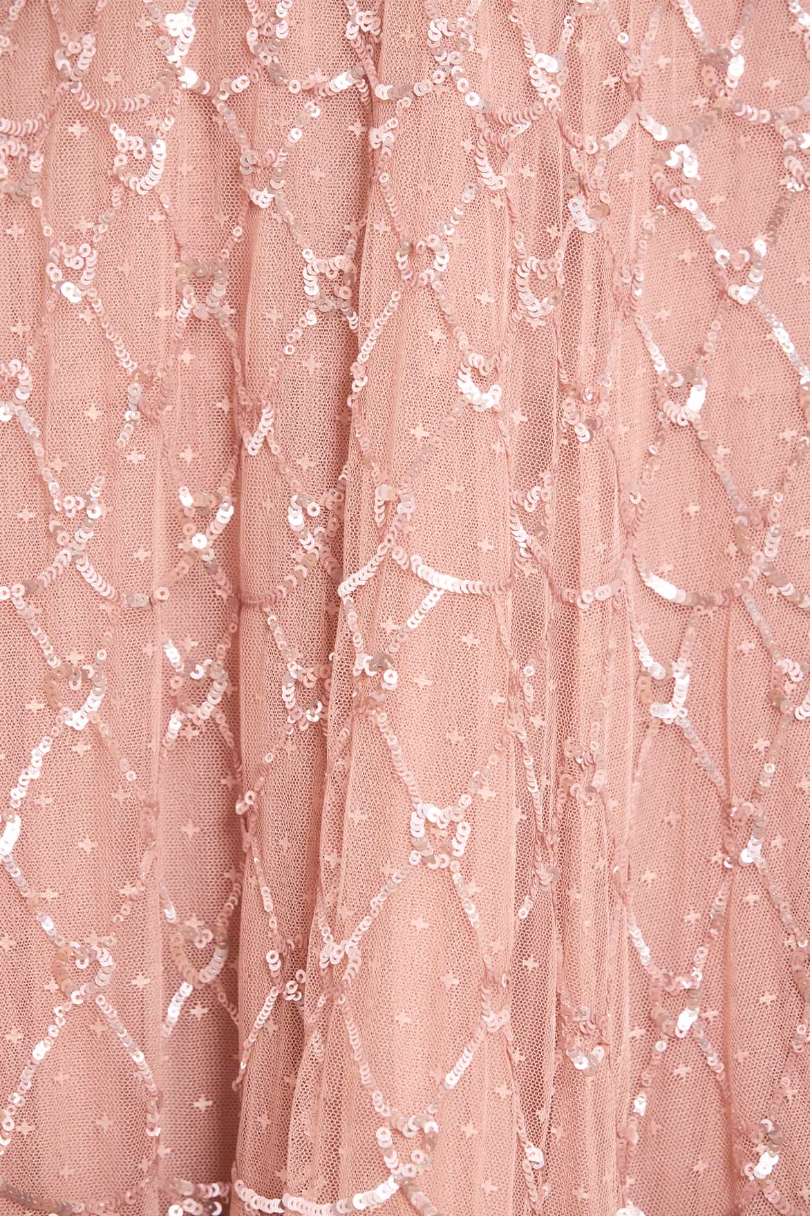 The Heart Lattice Ankle Gown in Rose Gold. This gown is decorated with intricate embellishments made using the smallest sequins for exquisite detailing. Beautifully designed with heart-shaped motifs in a lattice layout. This gown features our new floor-length cape for romantic detailing and a statement look. Make an entrance at your next event.