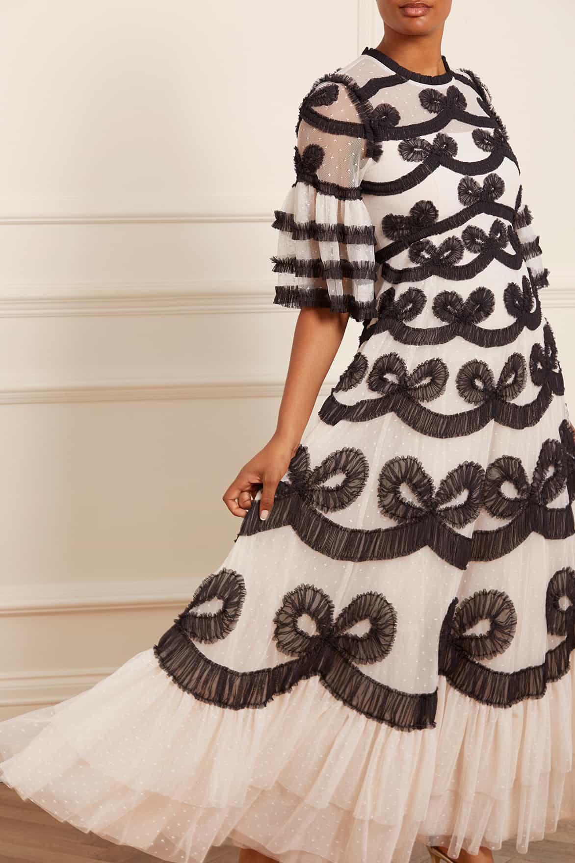 The Ingrid Gown in Cream / Graphite. This iconic Needle & Thread style is inspired by vintage ribbon bows. Beautifully engineered with delicate tulle and subtle texture to capture this ribbon motif. This signature Needle & Thread monochrome gown is bold yet truly romantic.
