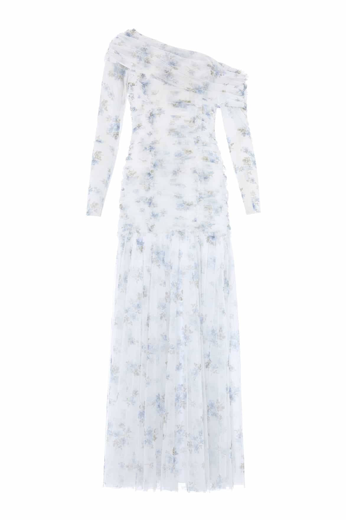 NEW SEASON. The Magnolia Ditsy One-Shoulder Rouched Gigi Gown in Moonshine/Skylight. Features a one-shoulder silhouette with gentle ruching and delicate ditsy floral print. Crafted from airy fabric for effortless drape, this gown is both contemporary and romantic.