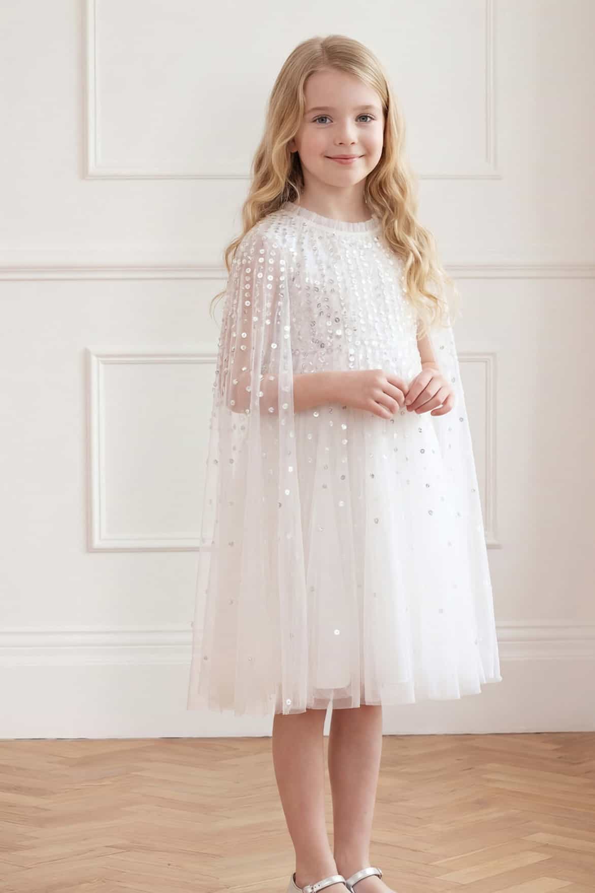 NEW SEASON. The Moonlight Sequin Cape Kids Dress in Swan White. Inspired by the shimmer of moonlit skies, this kids dress features delicate sequin detailing across a relaxed silhouette. Finished with a flowing cape detail and a softly layered skirt, it creates magical movement. A beautiful choice for a special occasion.