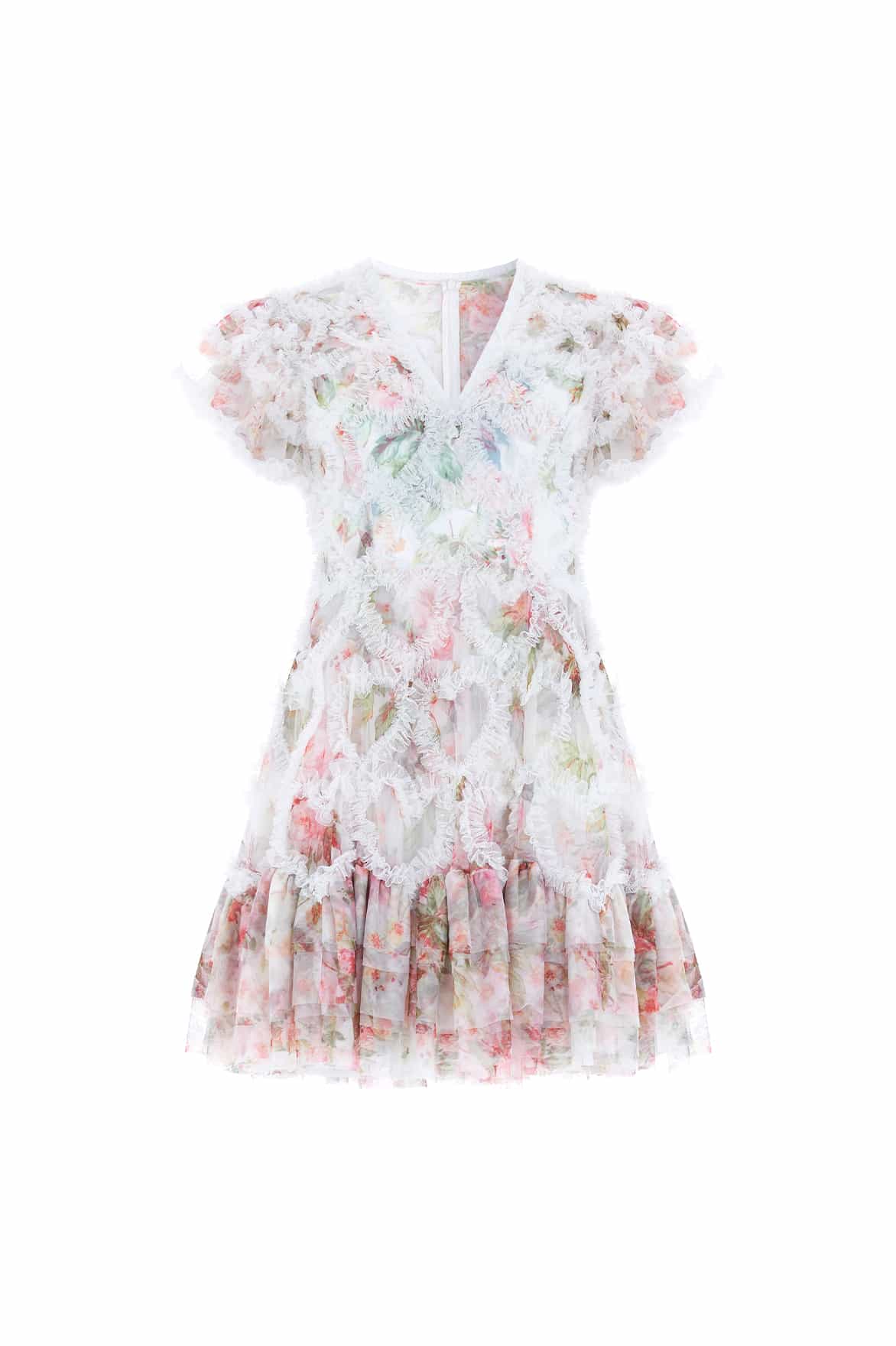 - Printed tulle decorated with contrast kisses tulle frills across the bodice, skirt and sleeve