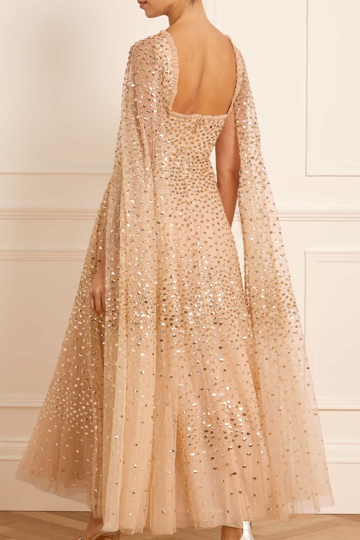 The Scatter Dot Cape Sleeve Ankle Gown in Antique Gold. This embellished gown is decorated with exquisite shimmering dot motifs, undulating in wave formations for a captivating glittering effect. Designed with a sweeping floor-length cape for romantic detailing and a statement look. The flattering square neckline is trimmed with signature Needle & Thread tulle frills. The skirt is made up of generous layers of net and tulle with a sweeping hemline. The perfect choice for an upcoming special occasion and beyond.