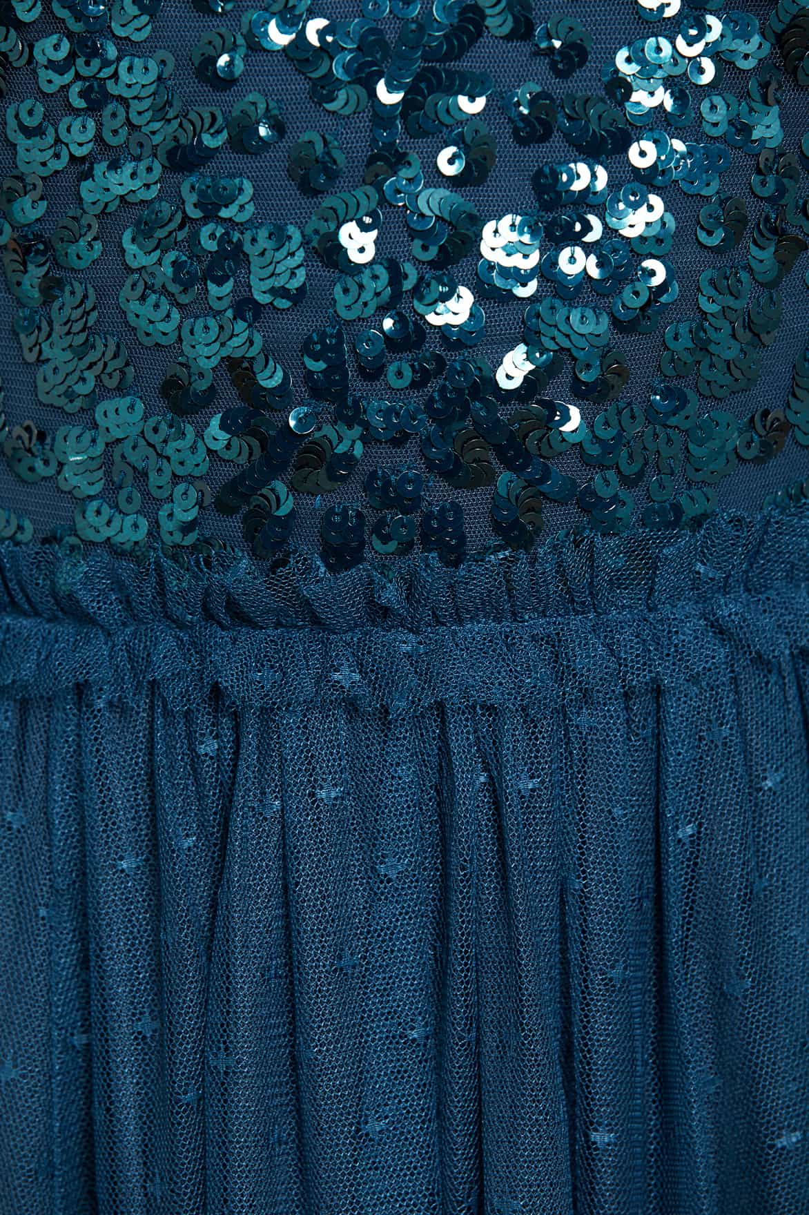 The Sequin Wreath Bodice Off-Shoulder Ankle Gown in Teal. This beautiful gown is crafted with an iconic off-the-shoulder design. Adorned with layers of delicate ruffles, along with an elasticated panel for comfort and hold. The bodice is beautifully decorated with shimmering sequins inspired by a vintage lace curtain. Designed with a romantic layered tulle skirt for signature Needle & Thread styling. A perfect gown for a special occasion.