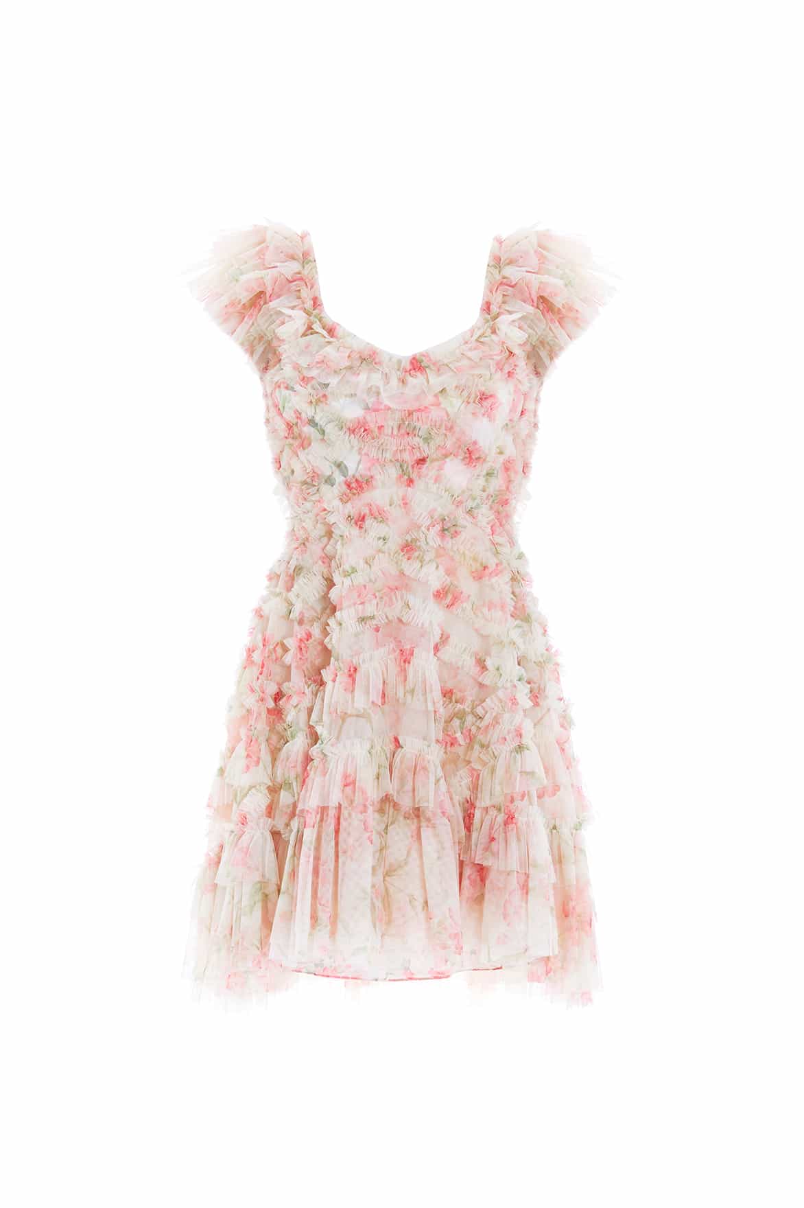 Meet the Summer Posy Lola Backless Micro Mini Dress in Moonshine / Coral. A hand-painted archive print featuring sunset and pink peonies in full bloom. This mini dress is decorated with pretty posy, floral clusters scattered and dispersed throughout to create an all-over beautiful print. Designed with signature Needle & Thread detailing featuring soft tulle, gathered frills and an engineered textile. Developed with a backless design and frothy sleeves for a playful, romantic look. Expect all eyes on you in this whimsical piece.