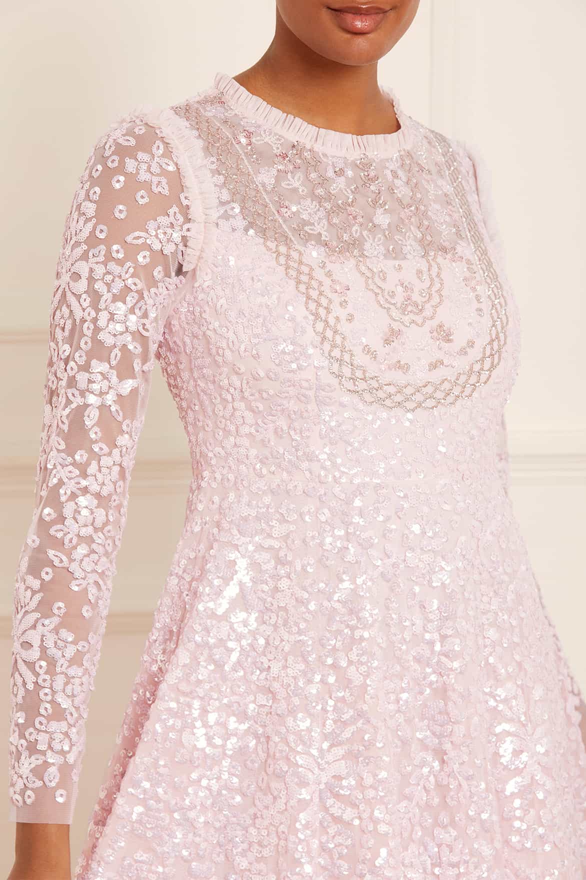 The Victorian Wreath Gloss Long Sleeve Gown in Peony Pink. This gown takes inspiration from Victorian panelling details. Beautifully adorned with an intricate sequin artwork featuring floral and bow motifs in a repeated wreath layout. Needle & Thread have sourced special sequins with extra foil coating to create an ultra high shine look. This gown is perfect for an upcoming special day.
