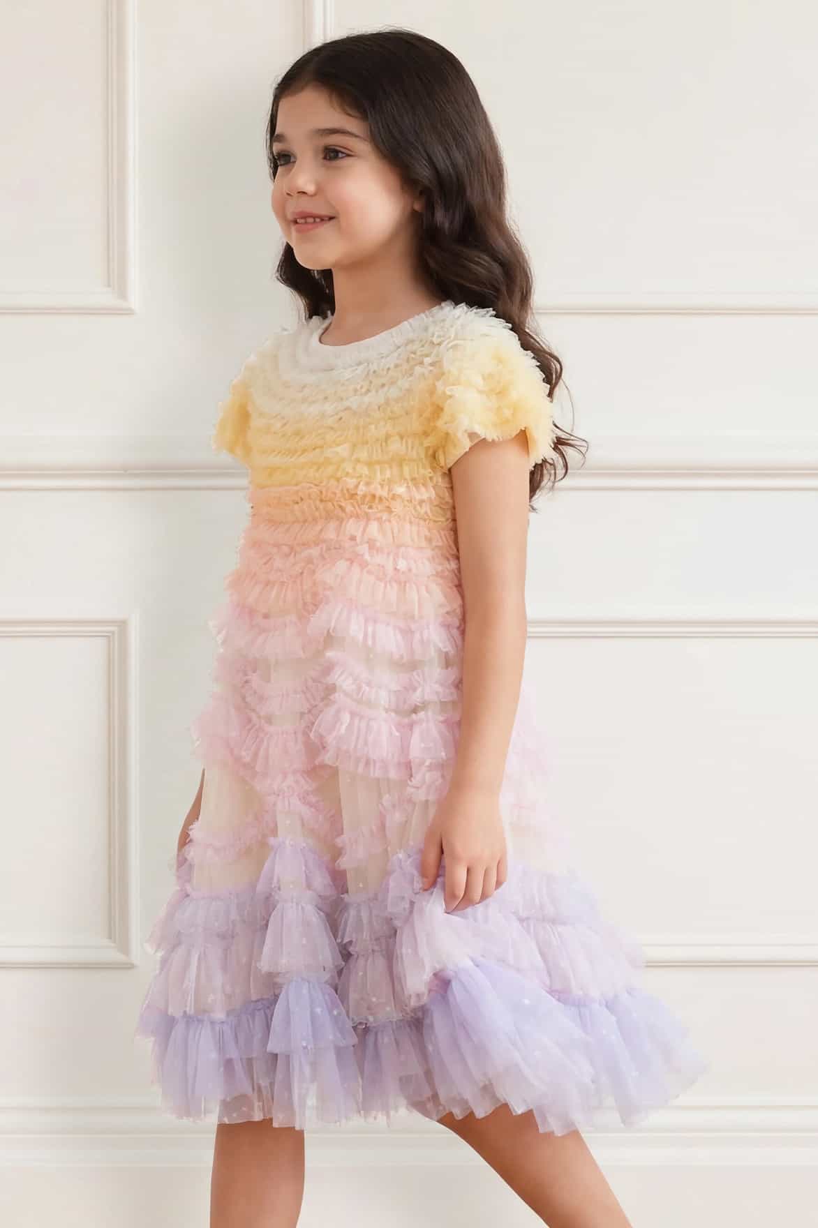 NEW SEASON. The Wild Rose Ombre Kids Dress in Sunset. This dreamy kids dress features a softly blended ombré palette that transitions through warm and cool garden-inspired tones. Designed with a relaxed shape and flowing skirt for beautiful movement. A magical style for a special occasion.