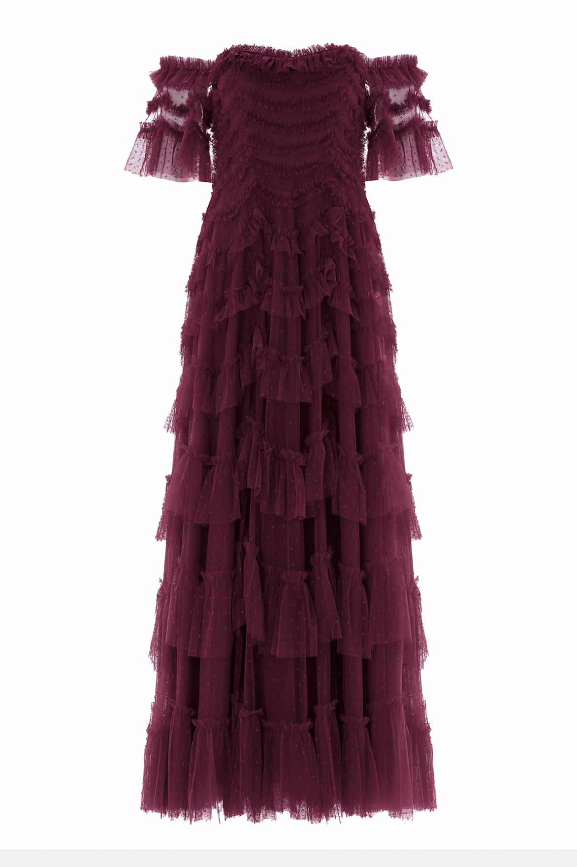 The Aviana Off-Shoulder Gown in Claret. A rich reinterpretation of a Needle & Thread signature. Designed with tiered scallop tulle and a romantic off-shoulder neckline, this style blends heritage-inspired textures with a deep wine-red hue.