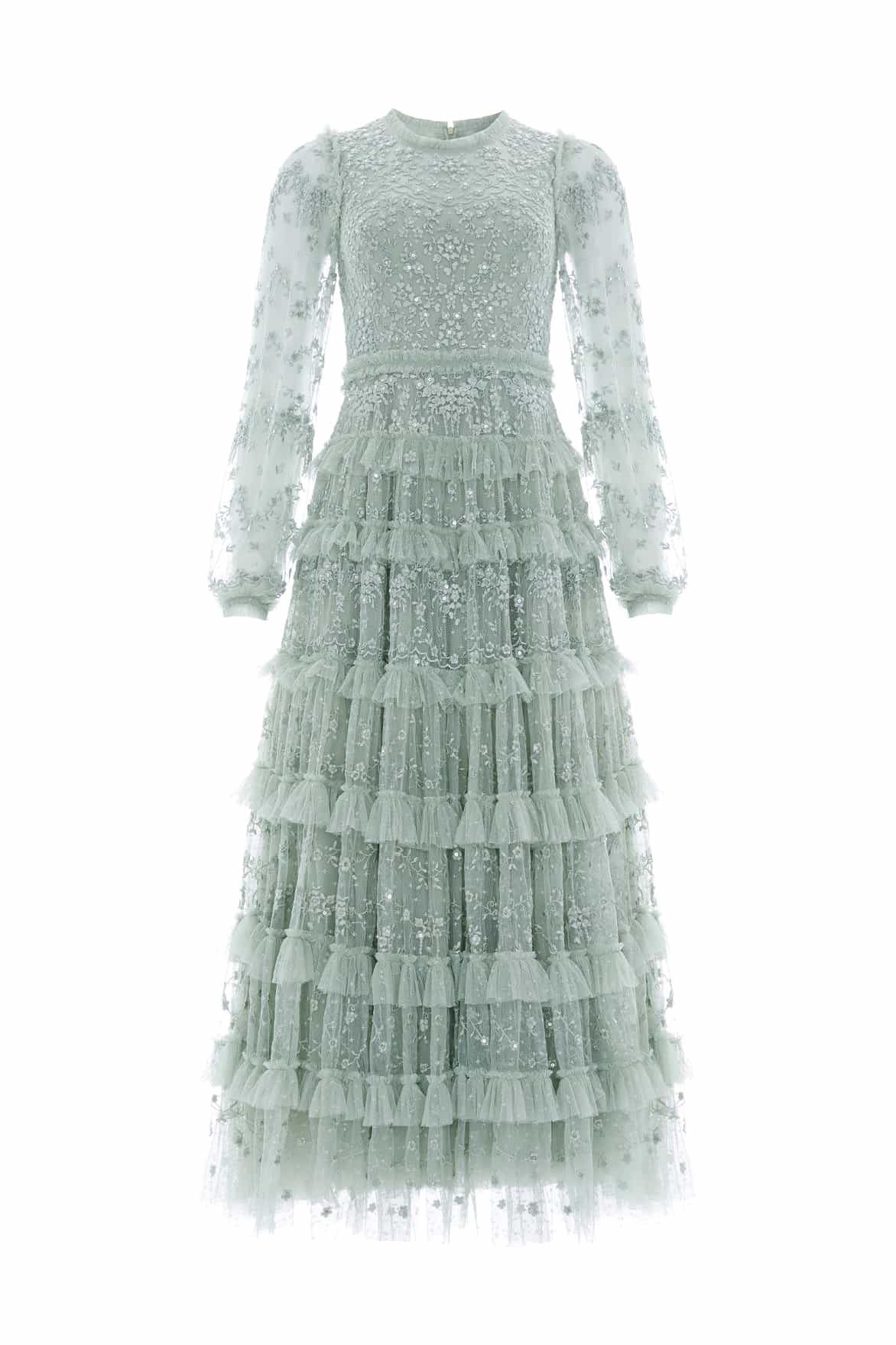 The Blossom Lace Ankle Gown in Laurel. A statement gown full of timeless elegance. Designed with a voluminous silhouette and cascading layered frills, this gown is adorned with delicate embroidery and subtle clear sequins that catch the light with every movement. A structured net layer adds definition, enhancing the gown’s dramatic shape. A truly show-stopping piece, perfect for unforgettable moments.