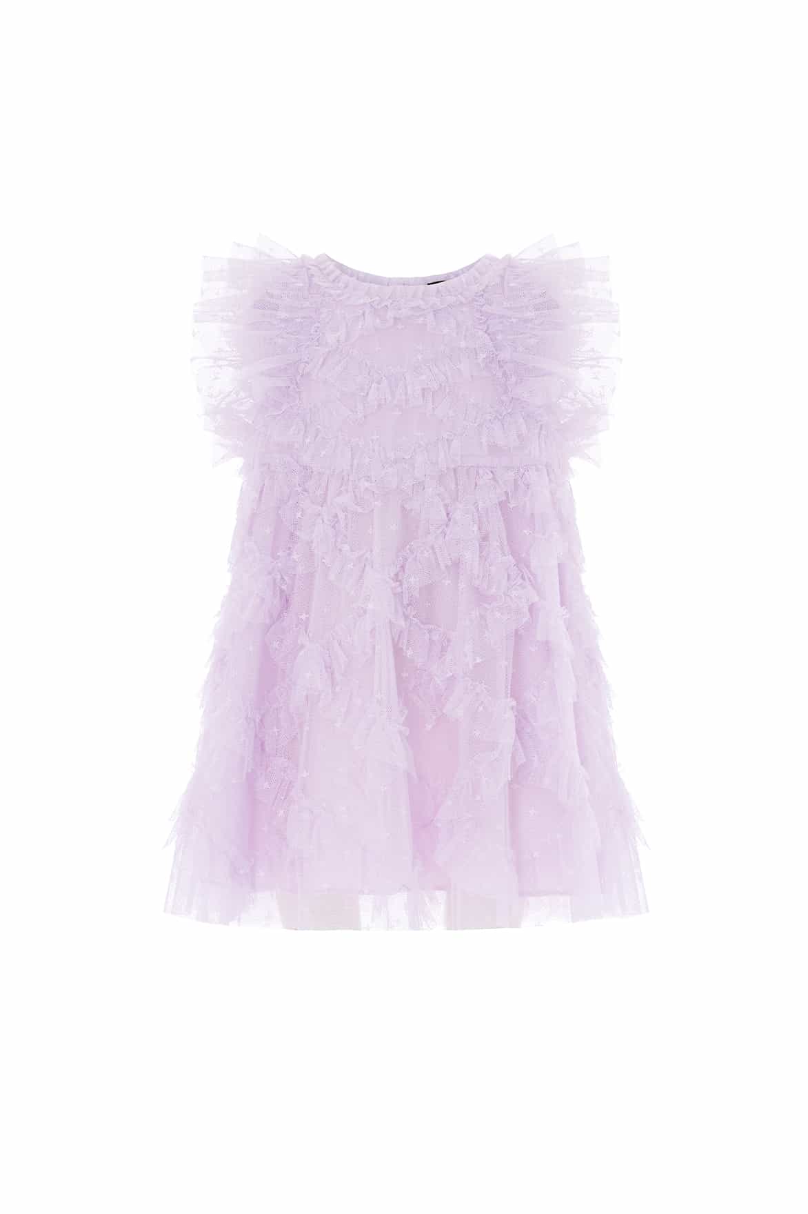 NEW SEASON. The Genevieve Baby Dress in Lilac Pearl. Decorated with intricate floral embroidery in soft pastel tones. Designed with a floaty silhouette and a gentle drape, it’s an enchanting piece for special occasions.