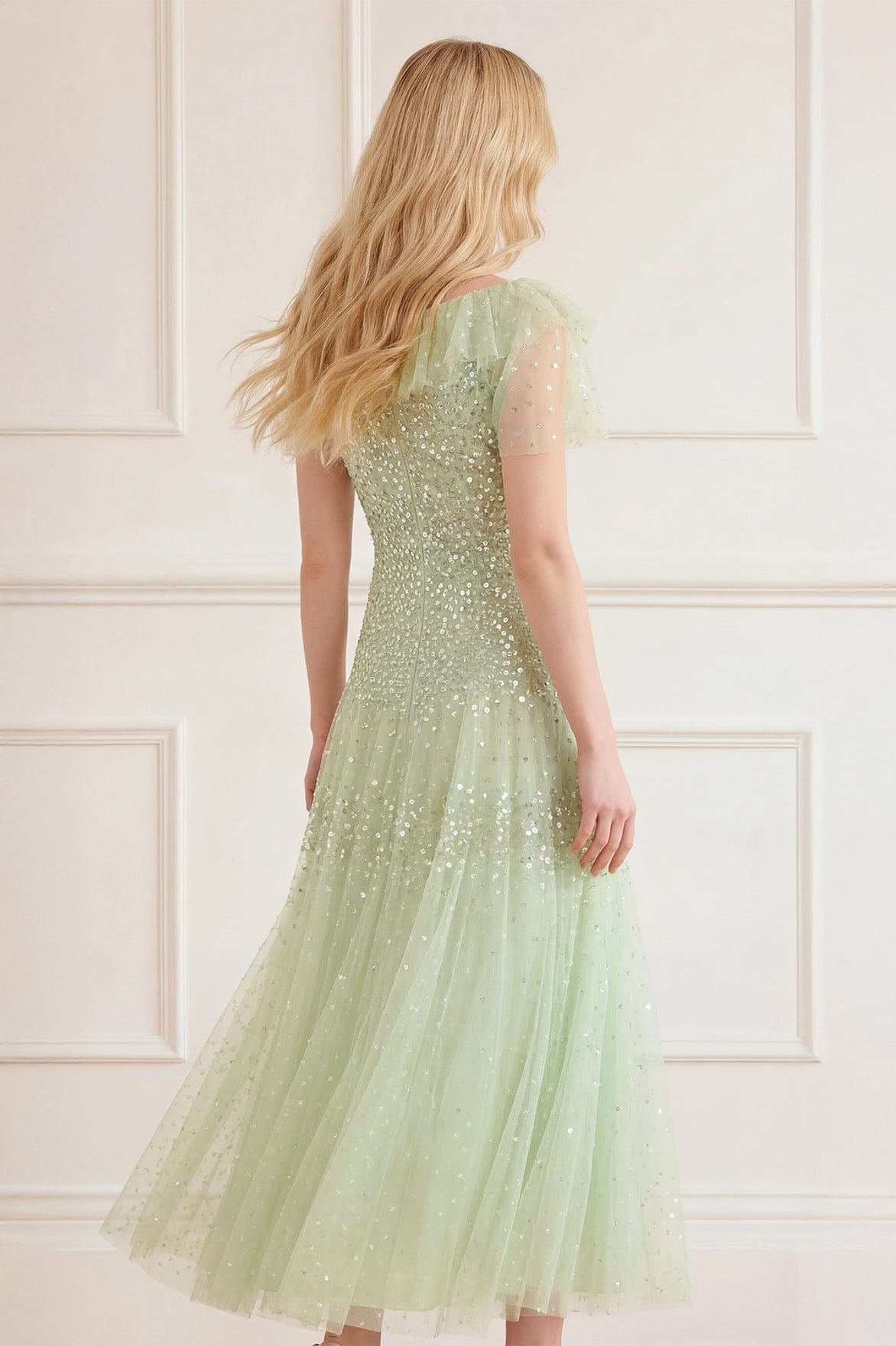 NEW SEASON. The Sunrise Sequin Short Sleeve Ankle Gown in Peppermint. Embellished with delicate sequin dot motifs arranged in softly fading linear bands that gently fade in and out, creating a subtle glittering effect. Designed with elegant short sleeves and a flowing silhouette that moves beautifully with every step. A radiant choice for luxury evening wear and special occasions.