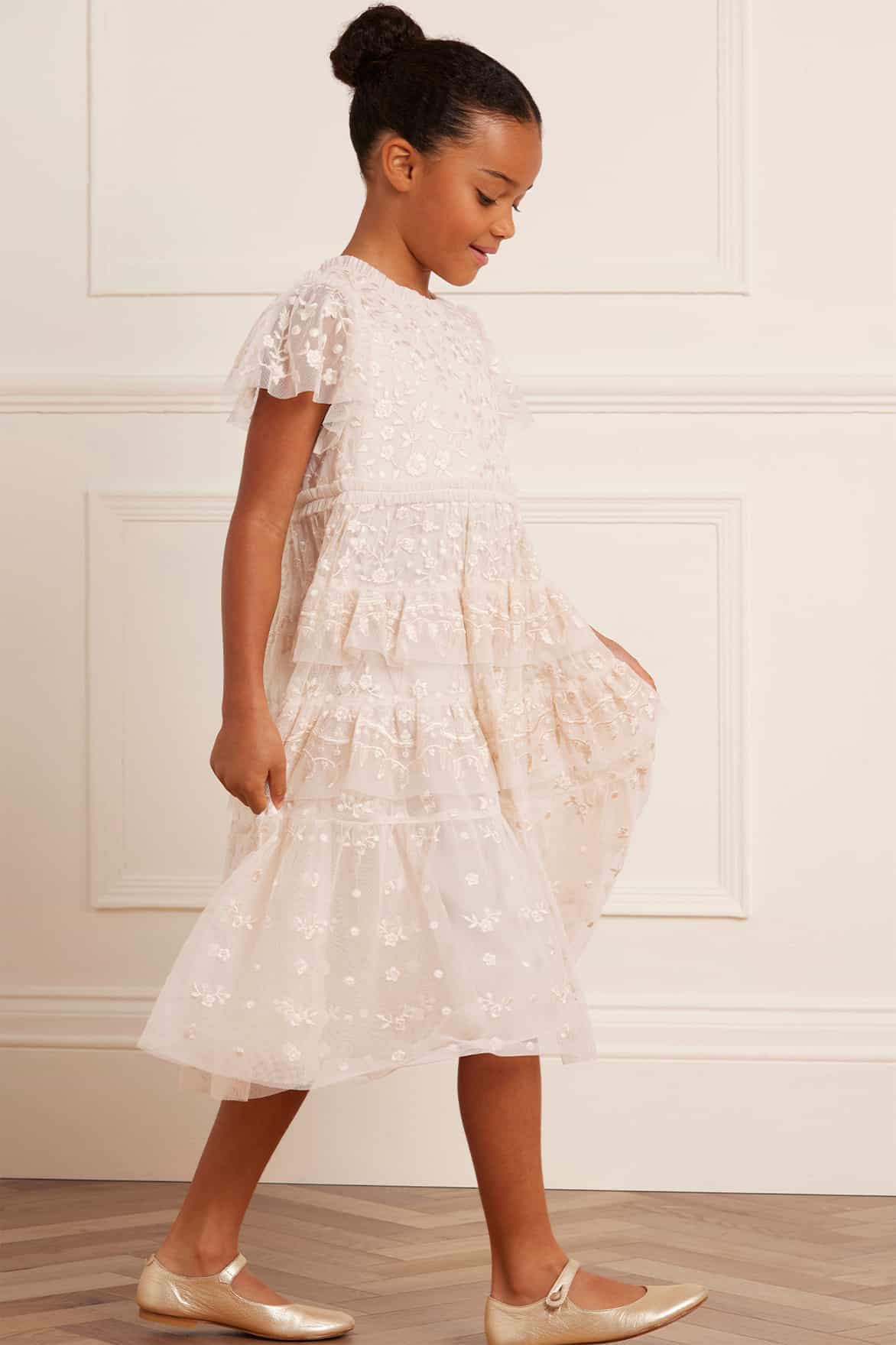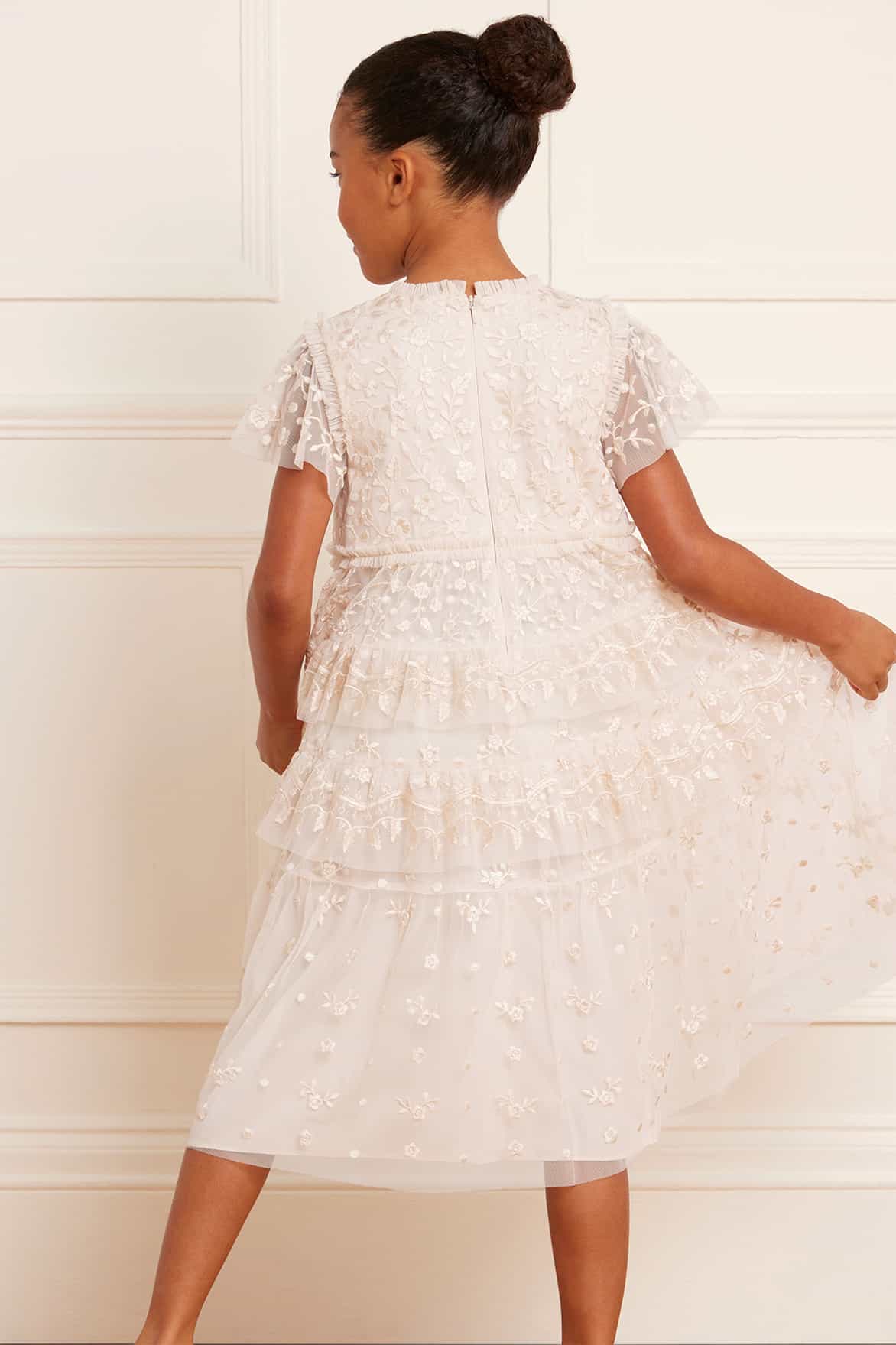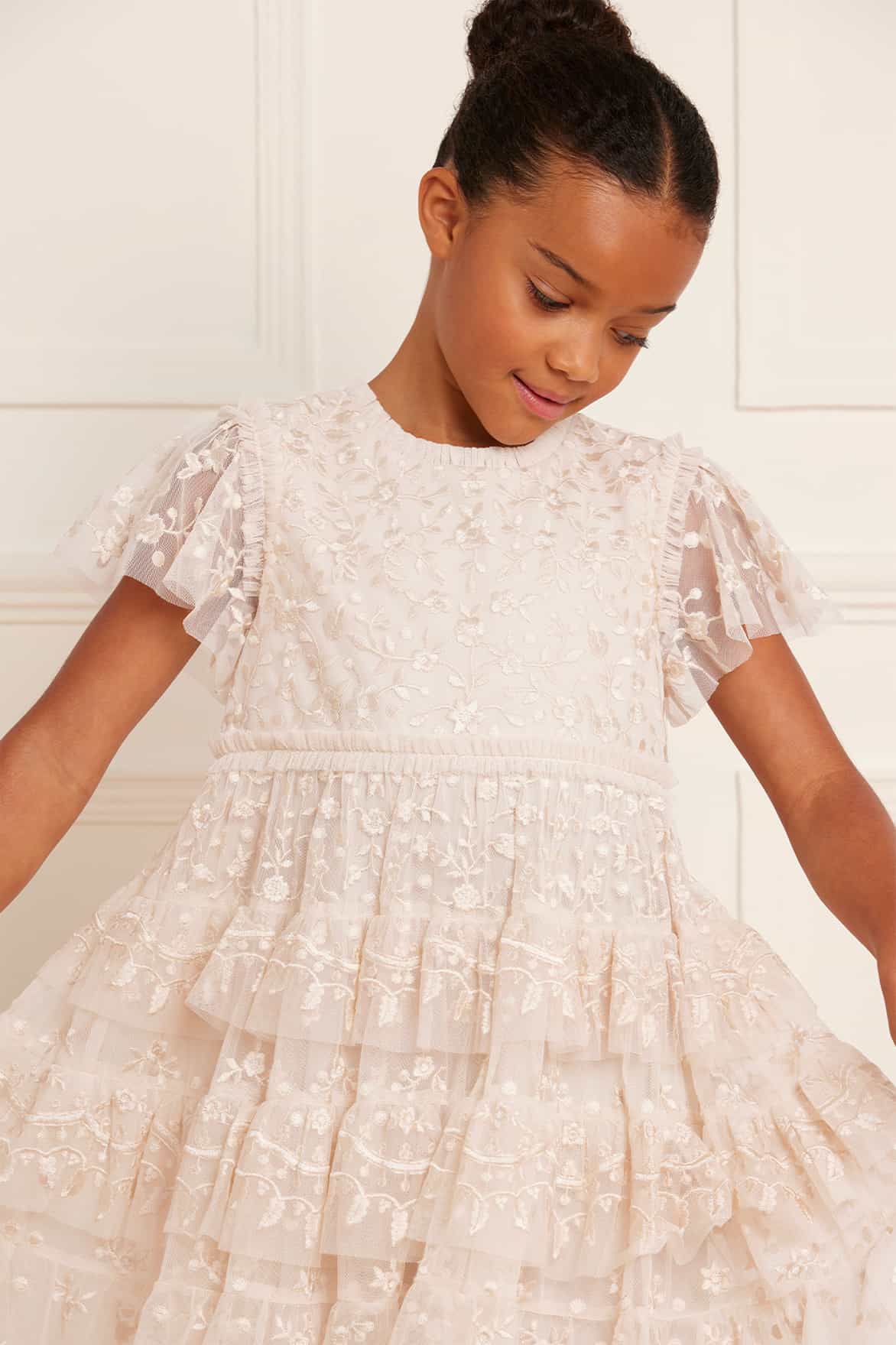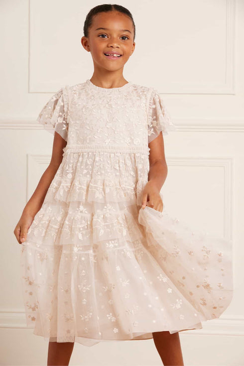 The Angelica Lace KIDS in Cream. This elegant dress is designed with intricate embroidery, inspired by Victorian lace trims. Tiered frills add a playful and charming quality to this timeless design. The ultimate addition to your little one's wardrobe.