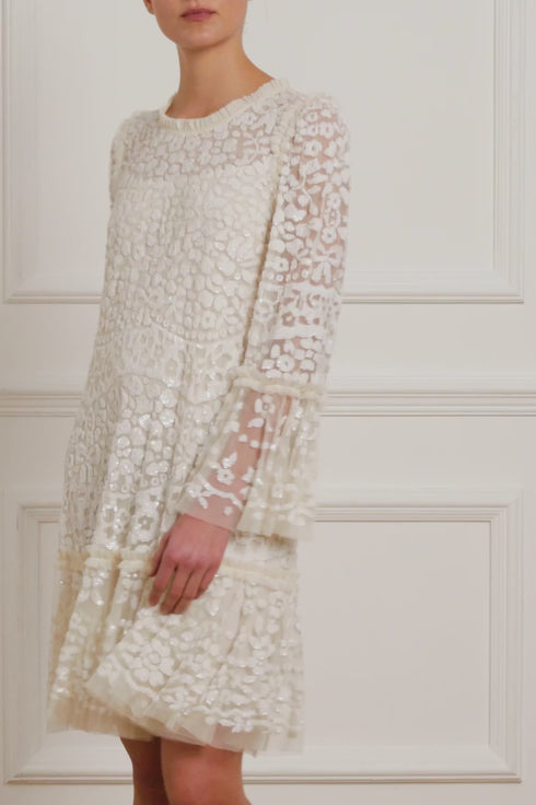 The Annie Sequin Tiered Mini Dress in Champagne. Adorned with shimmering sequins in a floral and bow artwork, this mini dress is inspired by a lace tablecloth. Designed with a loose fit silhouette and tiered throughout, creating beautiful movement. Make an effortless statement.