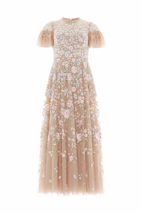 The Antoinettes Floral Round Neck Ankle Gown in Butterscotch. A nod to the lavish beauty of Versailles, the Antoinette Gown showcases exquisite multicoloured floral embroidery, cascading in delicate clusters toward the hem. The round neckline is framed by signature Needle & Thread tulle ruffles, while short sleeves are finished with softly gathered tulle frills for a whimsical touch. Crafted with generous layers of net and tulle, the ankle-length skirt flows into a graceful, sweeping hemline—bringing timeless romance to any occasion.