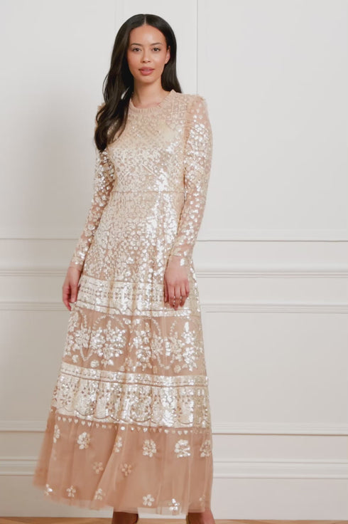 The Aurora Gown in Butterscotch/Gold. A signature Needle & Thread style from the archive, this timeless gown draws inspiration from antique tablecloths of the early 1900s. Intricately crafted with a shimmering placement border of sequins, it celebrates the art of vintage craftsmanship. The elegant silhouette features a round neckline, slim long sleeves, and delicate tulle frills at the neckline and armholes—a hallmark of the brand. Finished with layers of soft, romantic tulle, this heritage piece captures classic beauty with a modern edge.