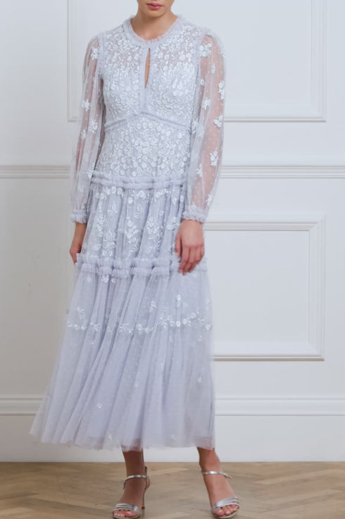 The Autumn Lace Long Sleeve Ankle Gown in Dusk Blue. This signature Needle & Thread style is designed with floral motif embroidery inspired by antique lace designs. This gown is developed with romantic sheer long sleeves, and a gathered tiered hem, and is created from layers of soft tulle to create a flattering silhouette. A classic and contemporary style.