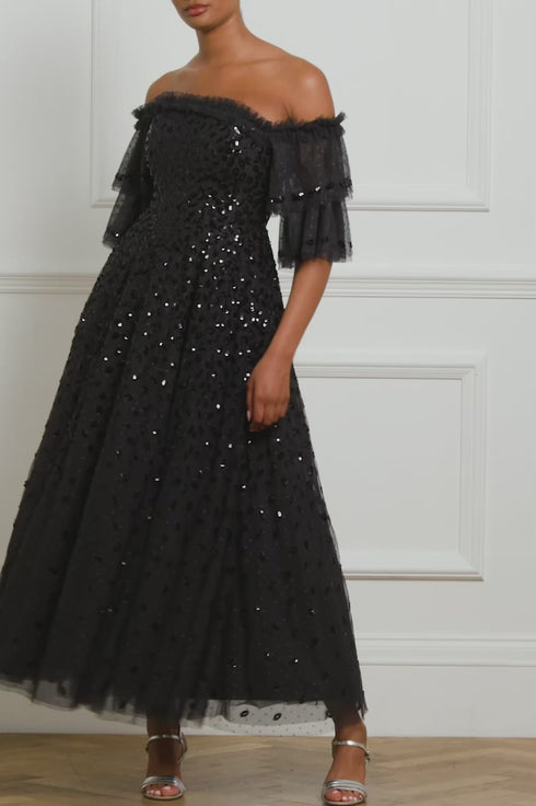 The Autumn Leaves Off-Shoulder Ankle Gown in Graphite. This ethereal piece is adorned with a glittering leaf motif that cascades gently towards the hem, capturing the essence of autumnal elegance. The gown features a romantic off-the-shoulder design complemented by tiered sleeves, each delicately edged with shimmering sequin embellishments. Crafted for comfort and style, the gown includes an internal corset made from stretch power mesh, ensuring a flawless fit while maintaining the garment's structure. The skirt is a true masterpiece, made up of layers of soft, delicate tulle and net, creating a generous and flowing silhouette that’s perfect for any special occasion.