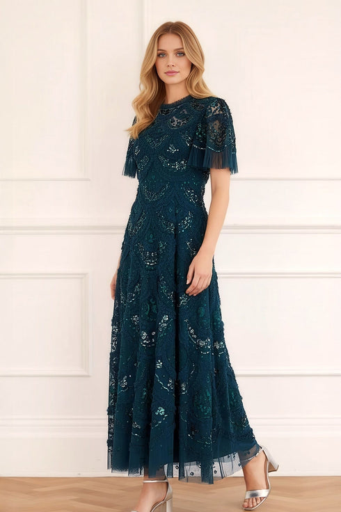 NEEDLE & THREAD EXCLUSIVE. The Carmen Ruffle Ankle Gown in Emerald. Designed with delicate tulle ruffles shaped into scallop sections, perfectly positioned to create a signature Needle & Thread romantic, textured look. This gown is beautifully embroidered with floral vine borders, featuring highlights of lustrous sequins for a glistening effect. A new wardrobe favourite.