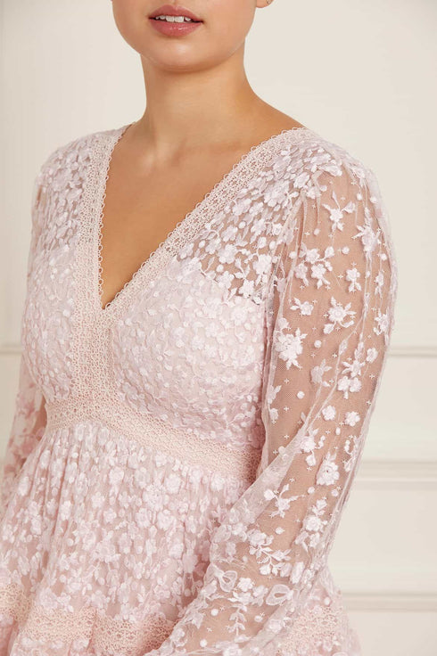 The Celestia Ribbon Mini Dress in Petal Pink / Pale Pink. This mini dress has been intricately designed with rich embroidery inspired by vintage lace, featuring delicate floral motifs and ribbon bows throughout. Crafted with pretty lace trims for signature Needle & Thread detailing, and delicately constructed with a textured tulle fabric base. Featuring a V-shaped neckline and a new, ultra-flattering silhouette. Make the ultimate statement in the Celestia.