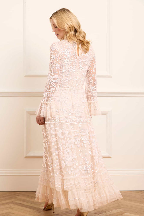 NEEDLE & THREAD EXCLUSIVE. The Celia Long Sleeve Ankle Gown in Cream/Dusk Pink. This statement gown is designed with romantic artwork featuring ornate florals and ribbon bows, densely embellished with shimmering sequins for exquisite detailing. Designed with an effortless loose fit with soft, playful tulle frills on the hem and cuffs. A key piece in our collection.