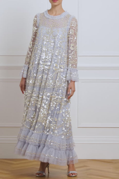 The Celia Long Sleeve Ankle Gown in Dusk Blue/Gold. This statement gown is designed with romantic artwork featuring ornate florals and ribbon bows, densely embellished with shimmering sequins for exquisite detailing. Crafted with an effortless loose fit with soft, playful tulle frills on the hem and cuffs. A key piece in our collection.