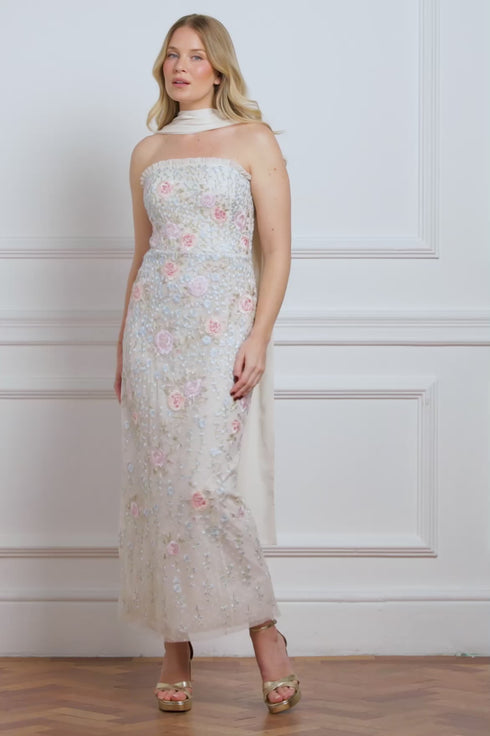NEW SEASON. The Cressida Strapless Ankle Gown in Cream/Multi. Richly embroidered with peony blooms and delicate trailing florals. Cut to a soft A-line silhouette with a flowing tulle skirt, this romantic gown includes a coordinating sash scarf for added drama.