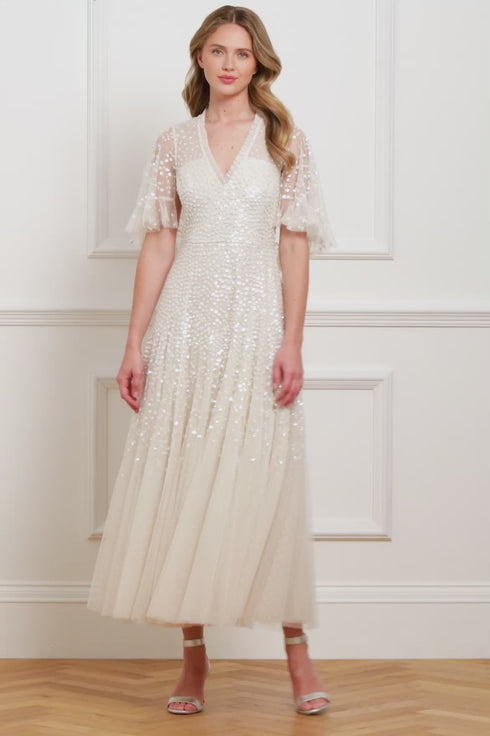 NEW SEASON | NEEDLE & THREAD EXCLUSIVE. The Dappled Sequin Cape Ankle Gown in Cream. A gracefully romantic design for the This ethereal gown features an integrated cape with softly gathered frill detailing, adding fluid movement and a touch of drama. Crafted with delicate clusters of shimmering sequins intricately scattered across the fabric, creating a light-catching, dappled effect. Designed with signature Needle & Thread tulle ruffles framing the neckline, while chevron seaming sculpts the waist and hips before falling into a voluminous, frothy skirt. Crafted from generous layers of net and tulle, this gown is destined for truly unforgettable moments.