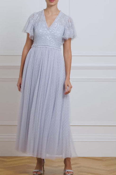 The Floral Lace Bodice V-Neck Ankle Gown in Dusk Blue. The bodice is adorned with shimmering sequin embellishments, featuring sequins with a special high-shine gloss finish created by an extra foil coating added to each sequin for an extra lustrous look. The flattering V- neckline, shoulders, and waistband are trimmed with signature Needle & Thread delicate tulle ruffles, while ethereal floaty frill sleeves add a touch of romantic styling. The skirt is crafted from layers of signature Needle & Thread soft tulle, enhancing the gown's enchanting allure.
